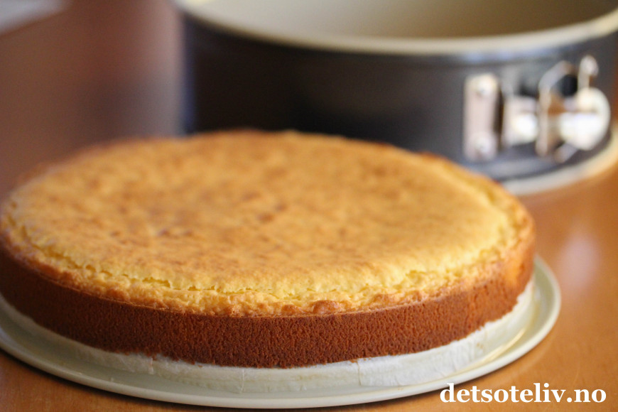 Stek kaken midt i ovnen ved 180°C i 20-25 minutter. Kaken skal fortsatt være bløt i midten. Avkjøl kaken i romtemperatur og la den deretter stå i kjøleskapet i et par timer så den blir helt kald. Kaken vil da bli fastere i konsistensen slik at den lett kan tas ut av formen og over på et kakefat.