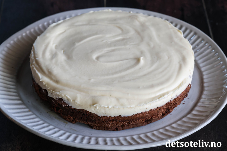 Sett kakefatet i kjøleskapet til dagen etter, slik at den hvite sjokoladekremen stivner.