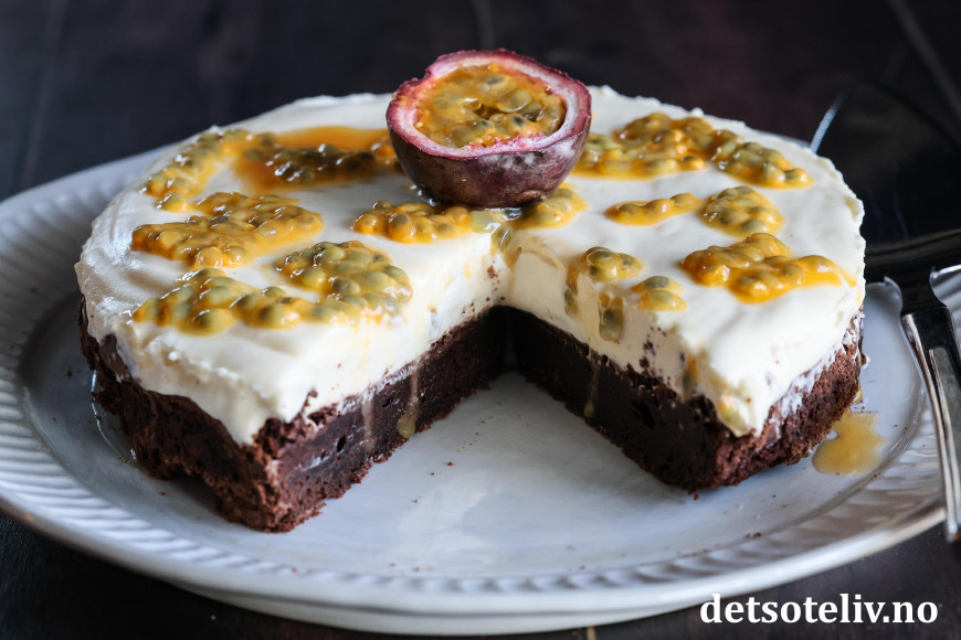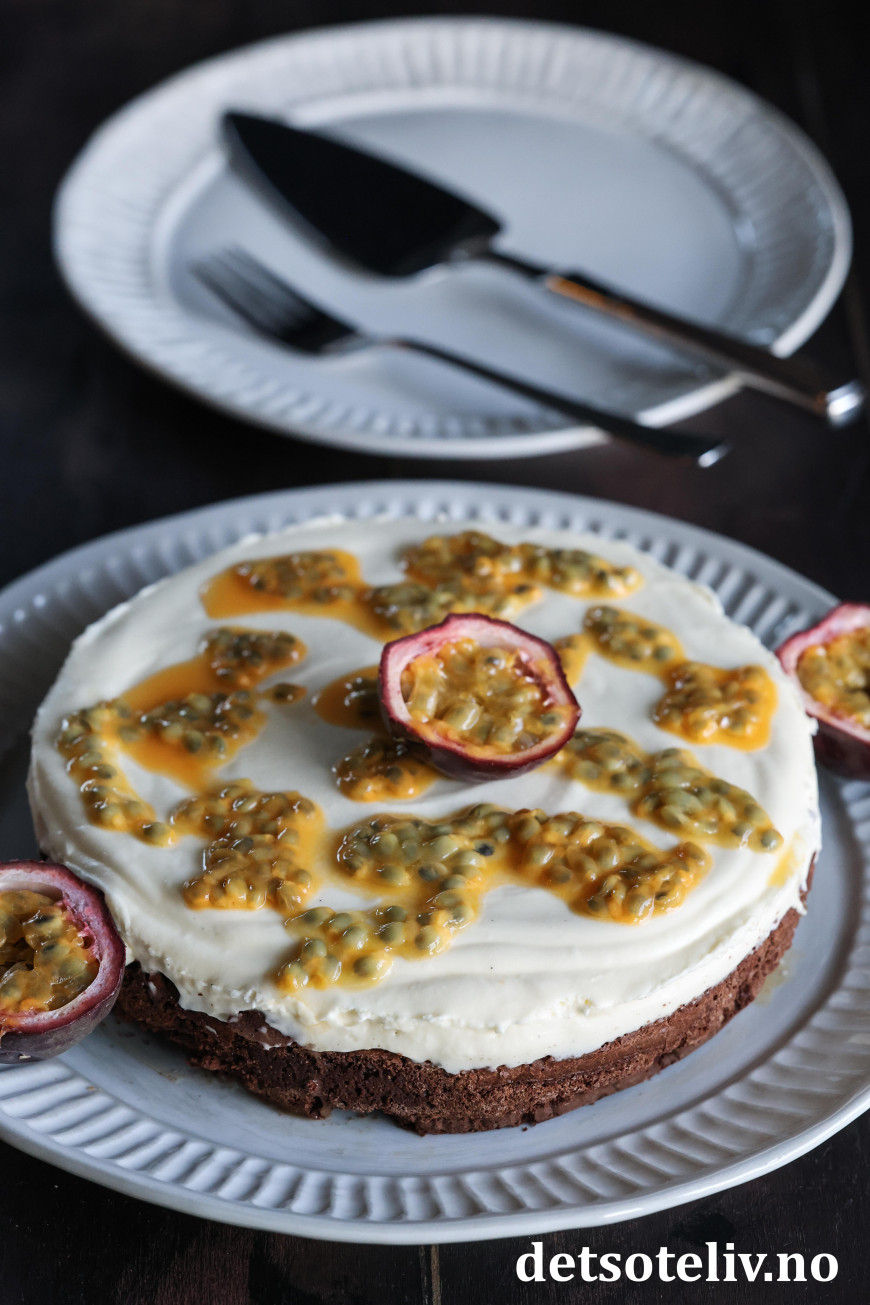 Her har du en nydelig sjokoladekake med hvit sjokoladekrem og herlig, syrlig pasjonsfrukt på toppen.