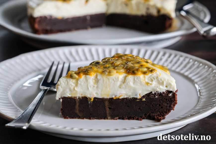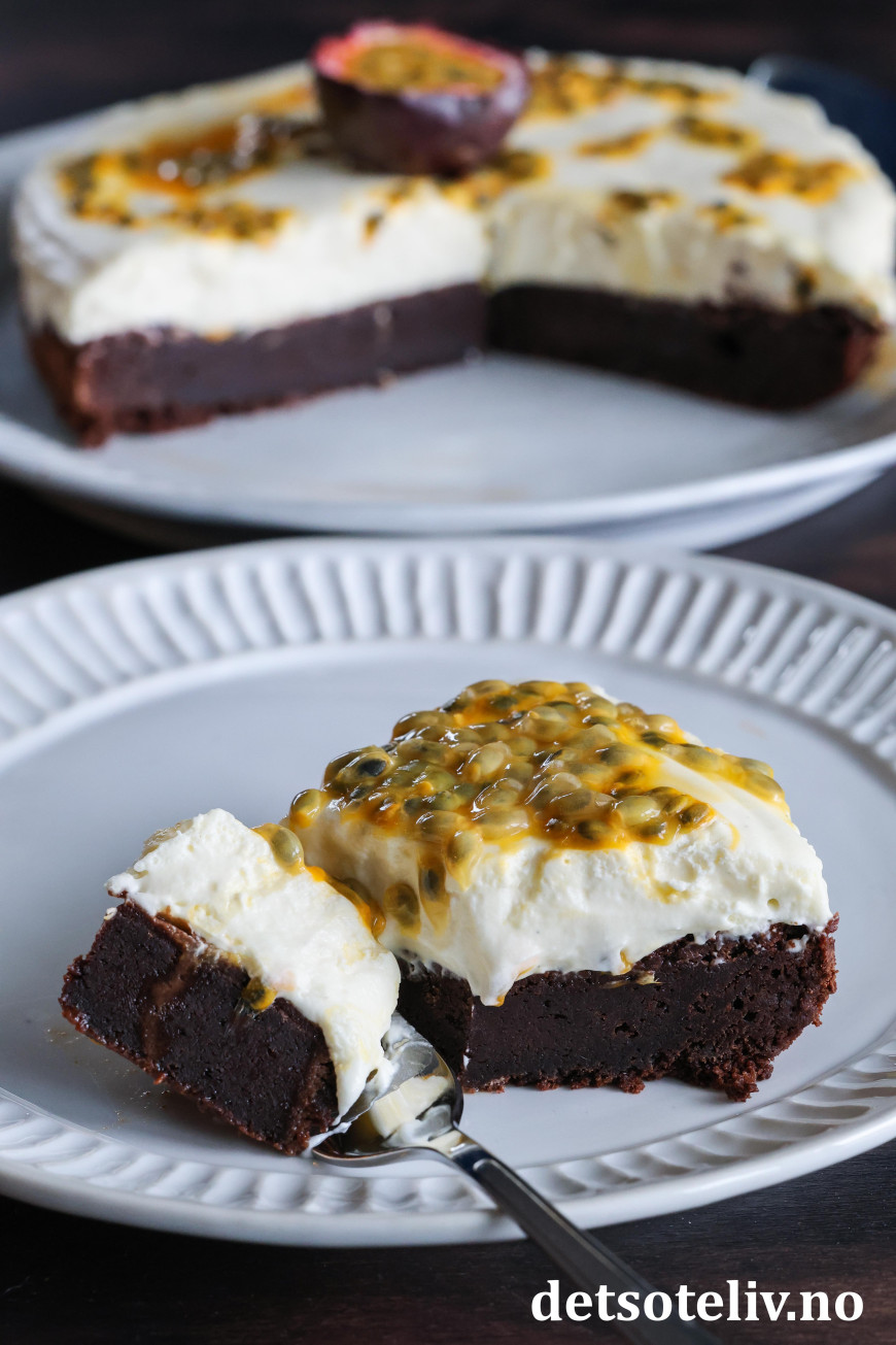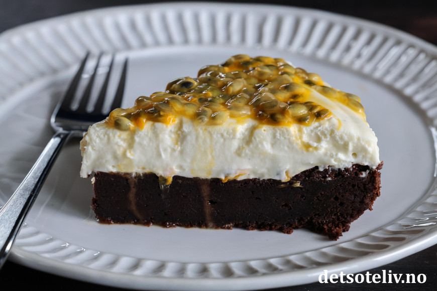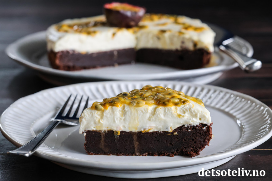 Syrlig pasjonsfrukt er i herlig kontrast til den søte smaken på sjokoladekaken og den hvite sjokoladekremen. 😍