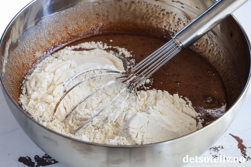 Pisk egg, sukker og vaniljesukker lett sammen med en ballongvisp (ikke meningen å piske eggedosis). Rør inn sjokolademøret. Bland deretter inn hvetemelet.