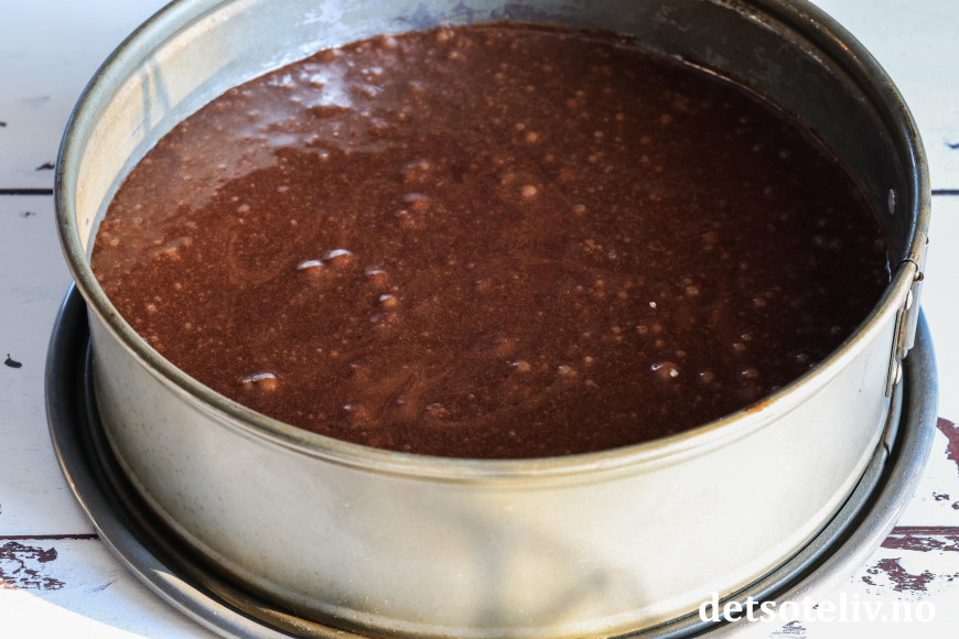Ha sjokoladedeigen i en rund form (24 cm i diameter) med bakepapir i bunnen.