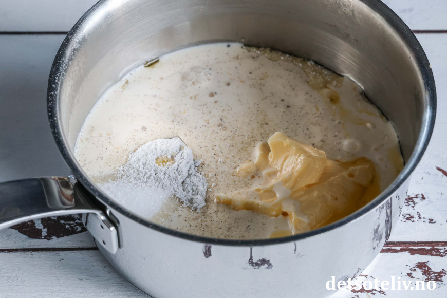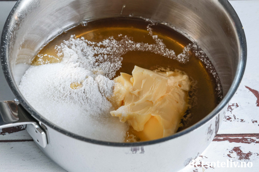 Lag kokostosca mens kaken steker: Ha smør, sukker, sirup, vaniljesukker og kremfløte i en middels stor kjele.