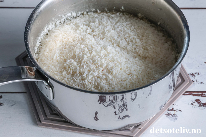 Varm opp til smøret har smeltet og la småkoke i ca. 1 minutt. Vend så inn kokos og ta kjelen av platen.