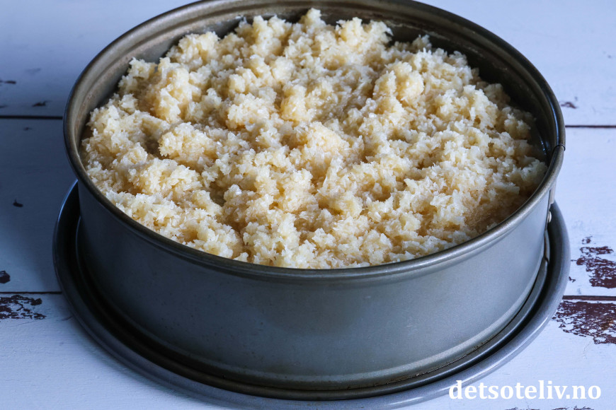 Når kaken har stekt 15 minutter, tas den forsiktig ut av ovnen. Kaken skal så vidt ha fått en fast overflate, men vil være veldig løs under. Bruk en spiseskje til å legge kokostoscaen oppå kaken (se tips).