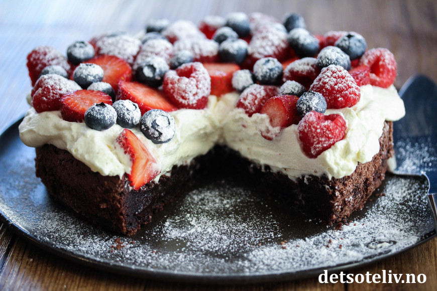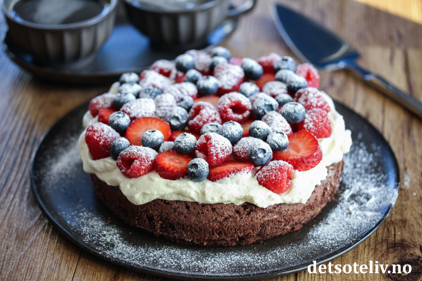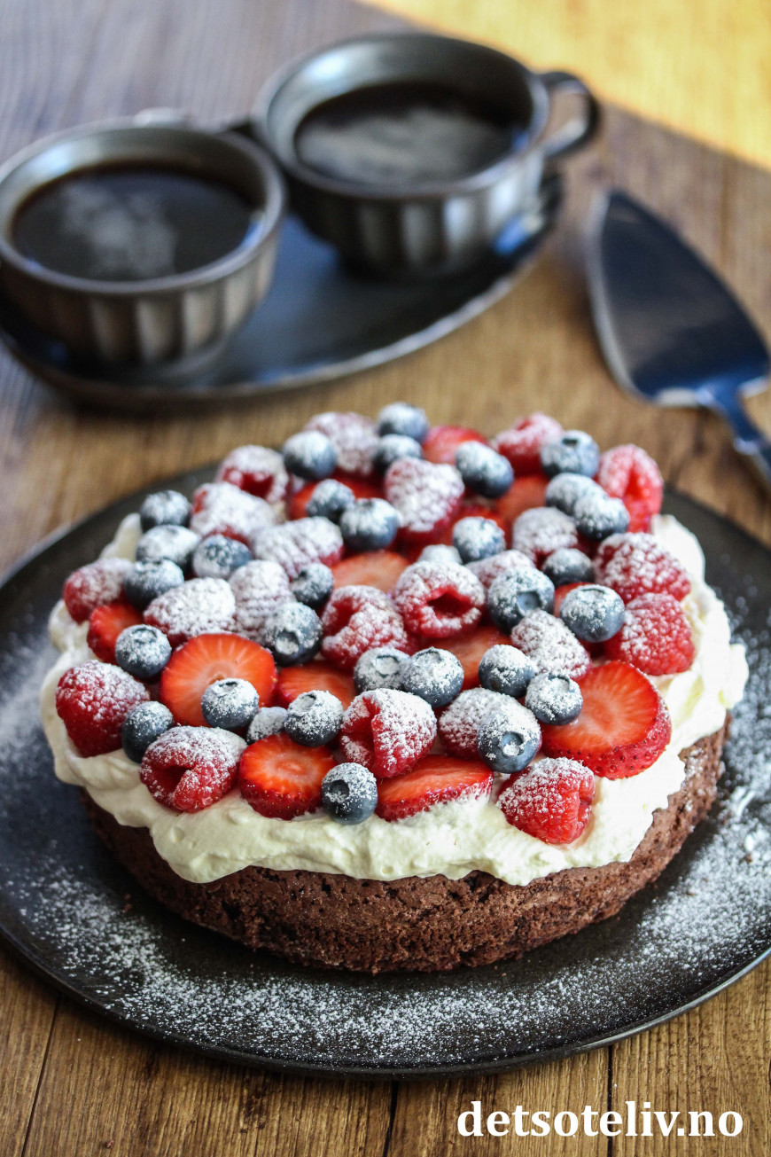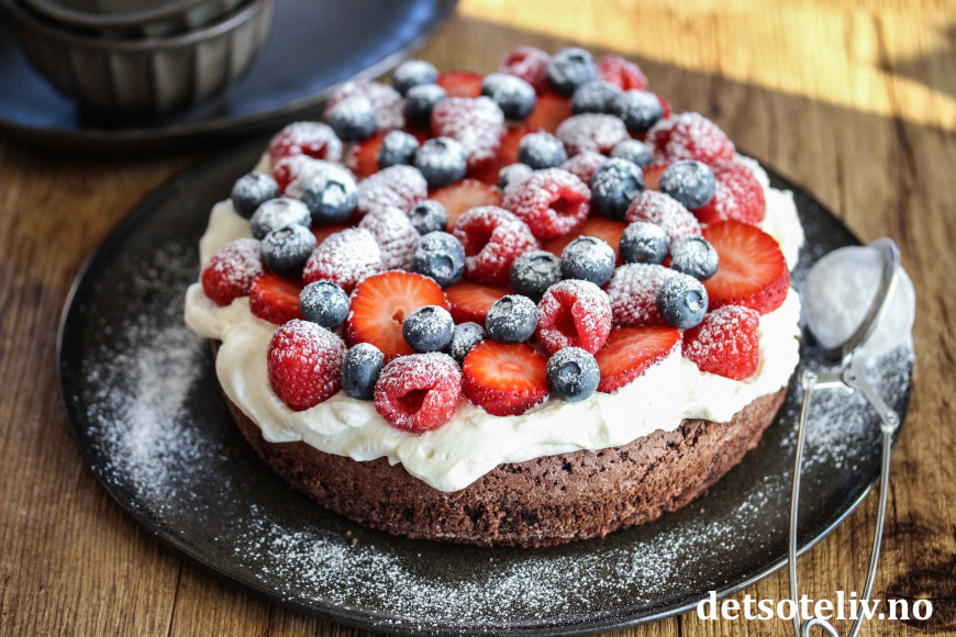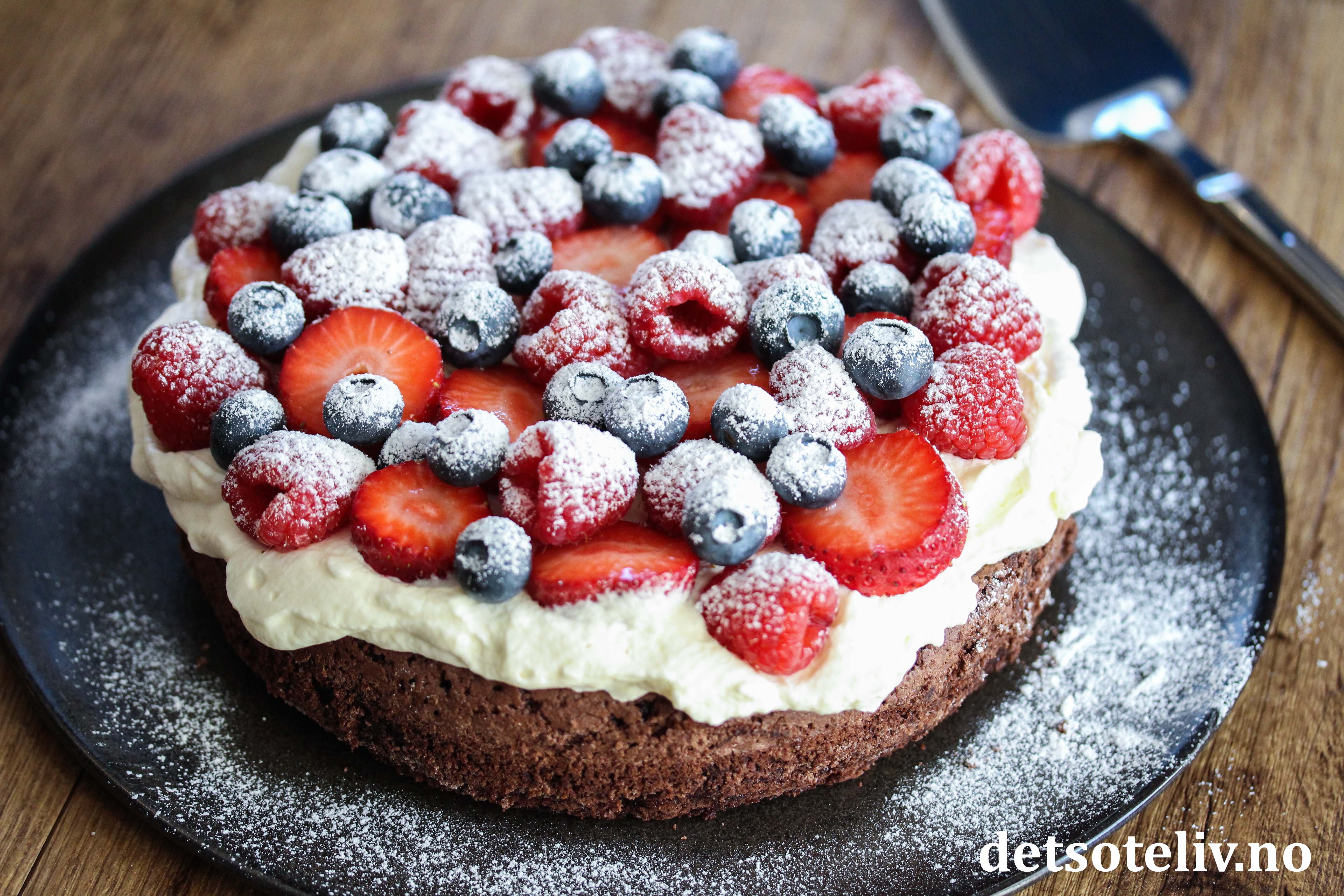 ♥ Kaken bør serveres samme dag som den dekkes med krem og bær, slik at kaken ser helt fersk ut. La den ferdigpyntede kaken stå i kjøleskapet frem til servering.