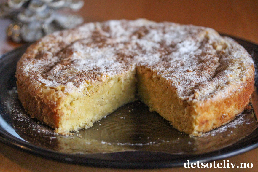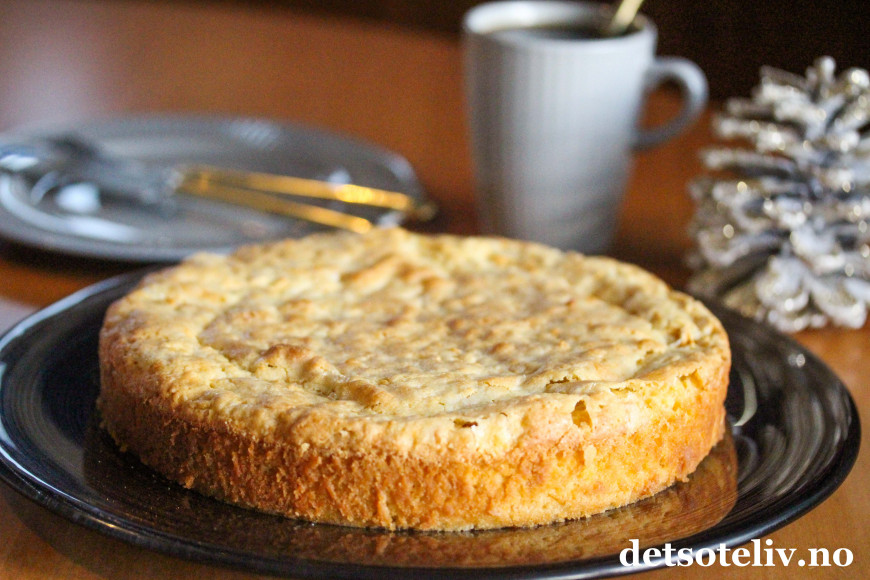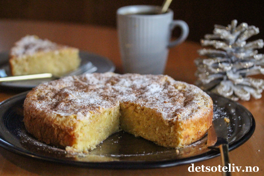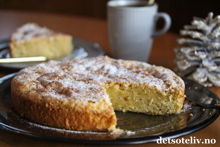 Stek kaken midt i ovnen ved 175°C i ca. 35 minutter. Kaken skal fortsatt være lys og littegrann bløt i midten.