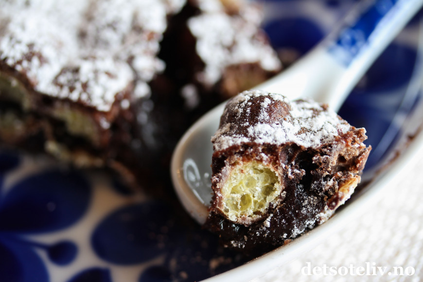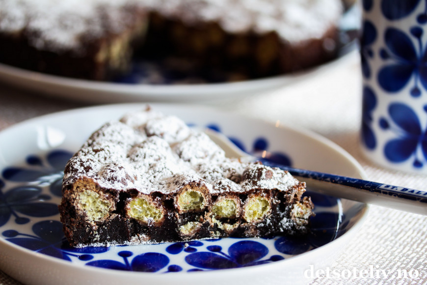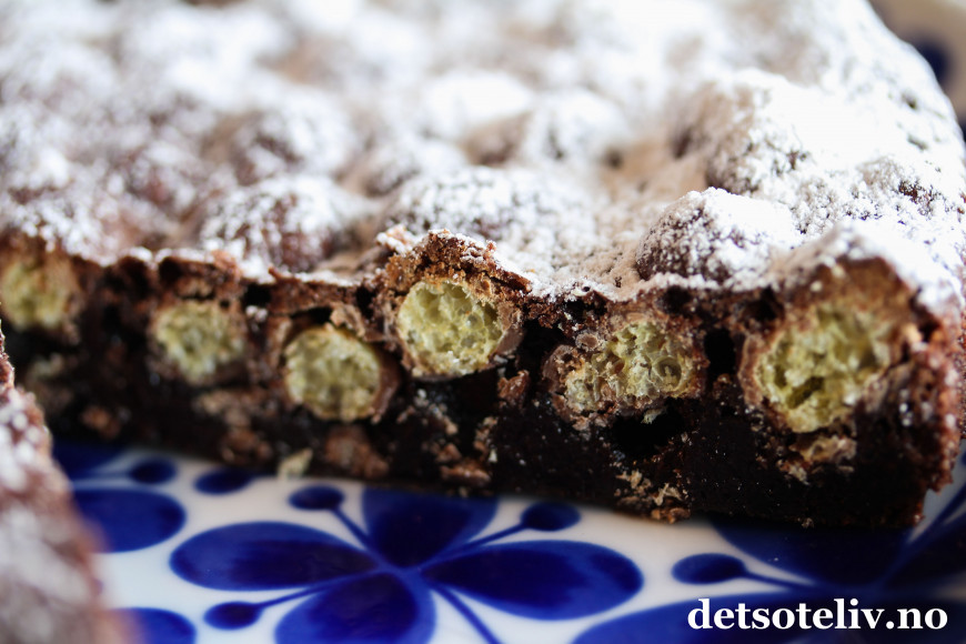 Her har du en superherlig kladdkake som gjøres veldig spesiell ved å tilsette puffet maissjokolade. Det kan være Kinapuffer (fra Fazer), Pops (fra Cloetta) som jeg har brukt her, Crunchy M mais (fra Freia) eller noe lignende.