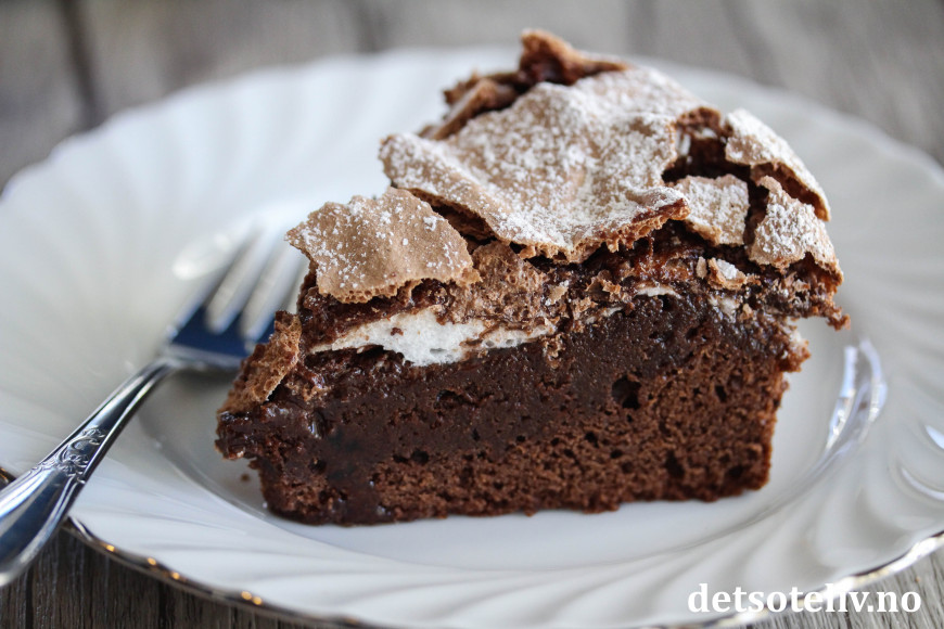 ♥ Den ferdigstekte kaken vil virke litt rå. Ikke la den steke lenger av den grunn, ellers vil ikke kaken få den bløte, kladdete kjernen som den skal ha. Etter en natt i kjøleskapet vil kaken bli fastere i konsistensen, og lett å ta ut av formen uten at den går i stykker.