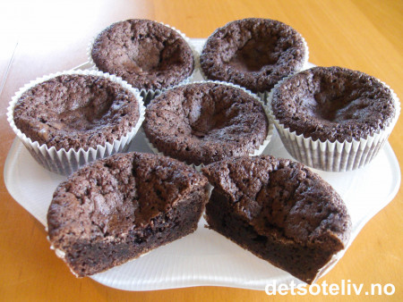 Hele cluet er å ikke steke disse muffinsene for lenge! Muffinsene skal ha en bløt kjerne i midten også når de er avkjølte. Muffinsene vil virke temmelig ustekte når de tas ut av ovnen, men de vil stivne til en god del når der er kalde.
