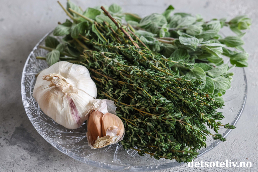 Ha finsnittet hvitløk og friske krydderurter i en liten skål sammen med olivenolje, sennep, salt og pepper. Rør dette sammen.