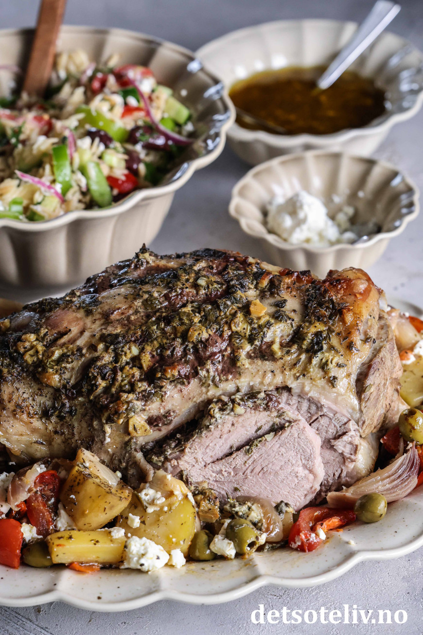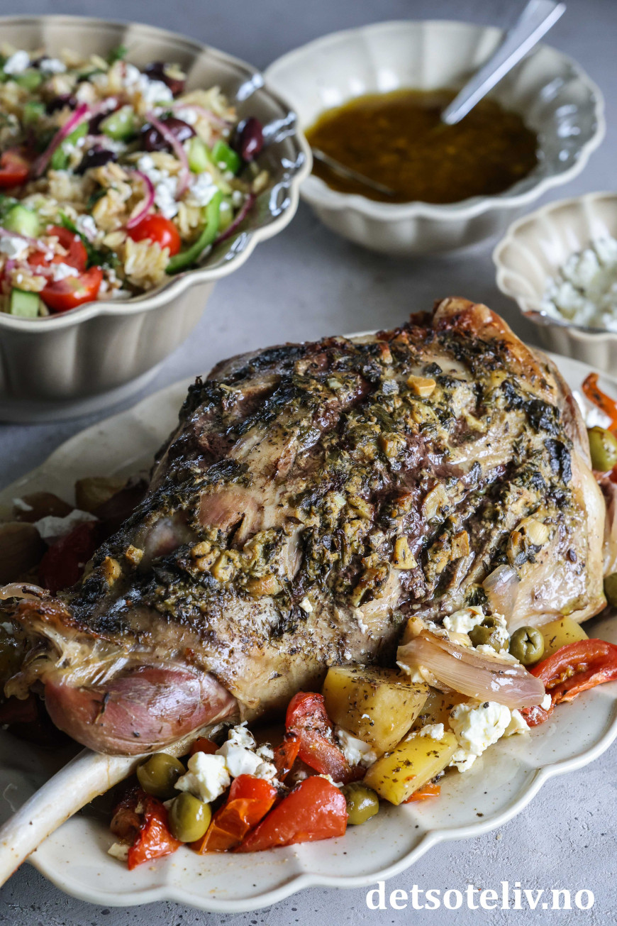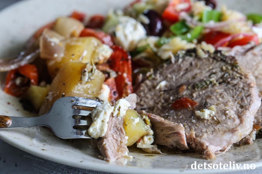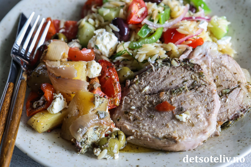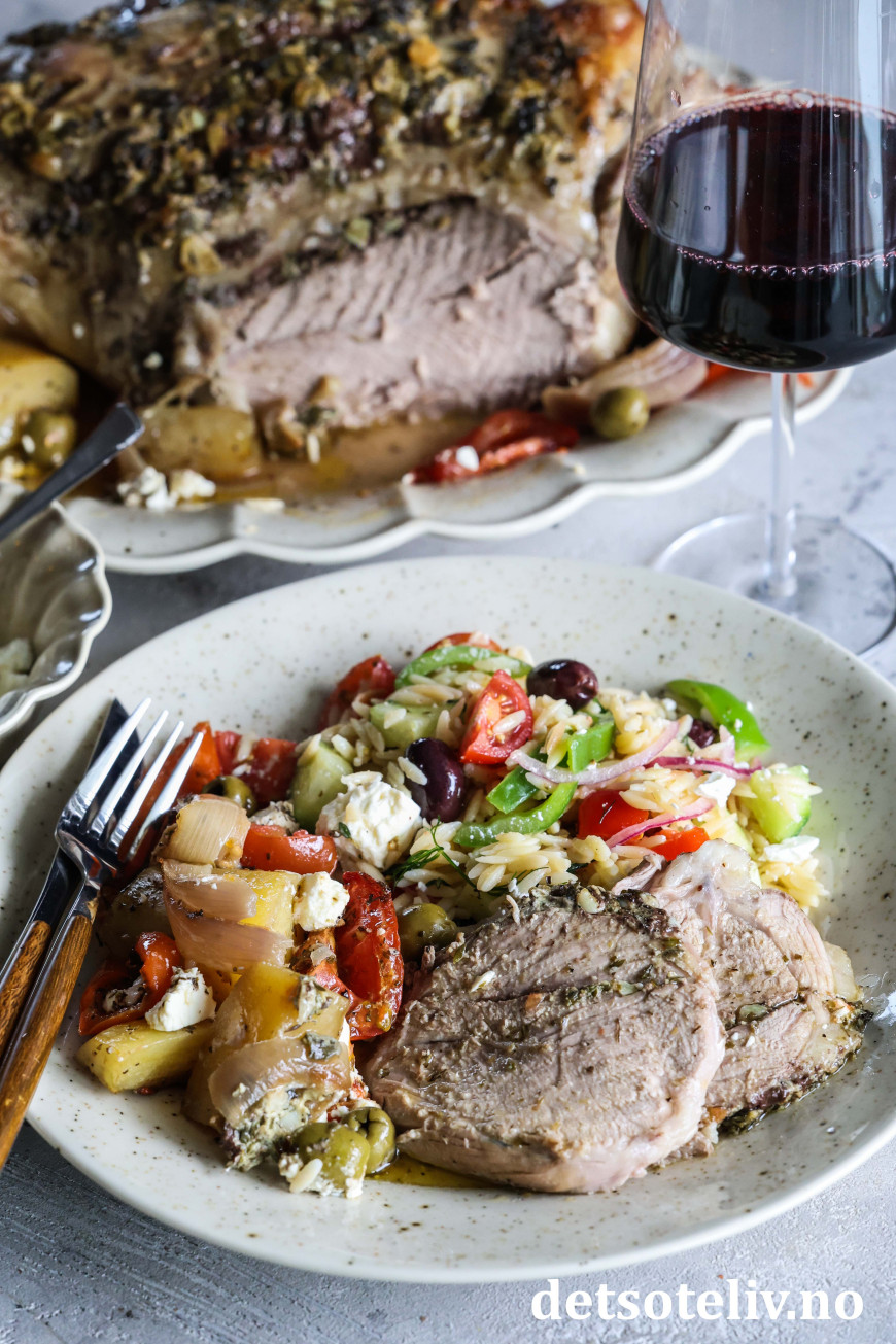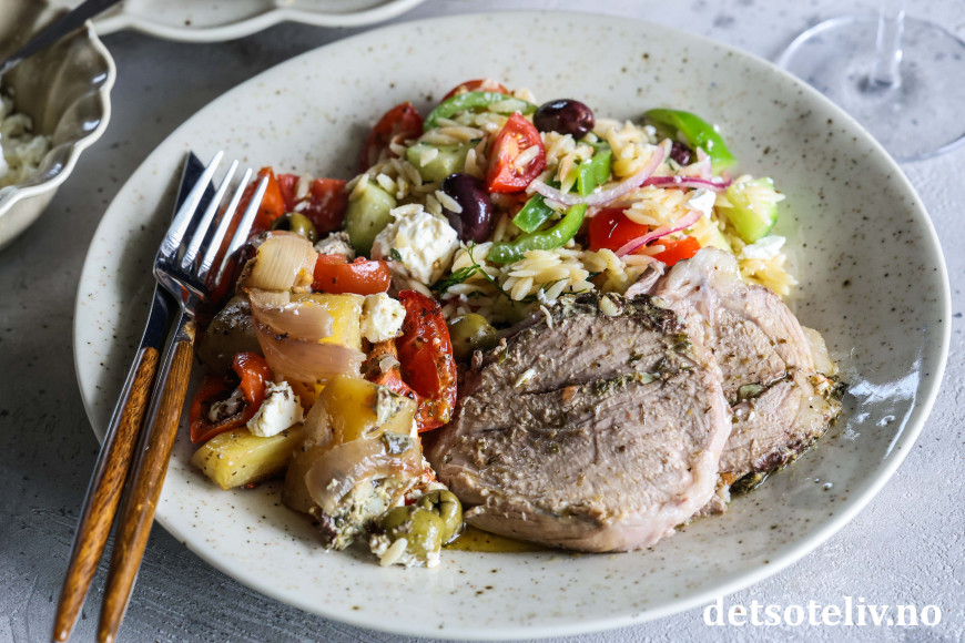 ♥ I tillegg liker jeg å servere en gresk salat ved siden av. Jeg brukte her en Gresk Kritharakisalat (Risonisalat / Orzosalat). Se også oppskrift på Gresk salat (Horiatiki salata) og Gresk pastasalat.
