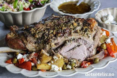 Du kan servere retten direkte fra langpannen eller flytte lammelåret og tilbehøret over på fat.