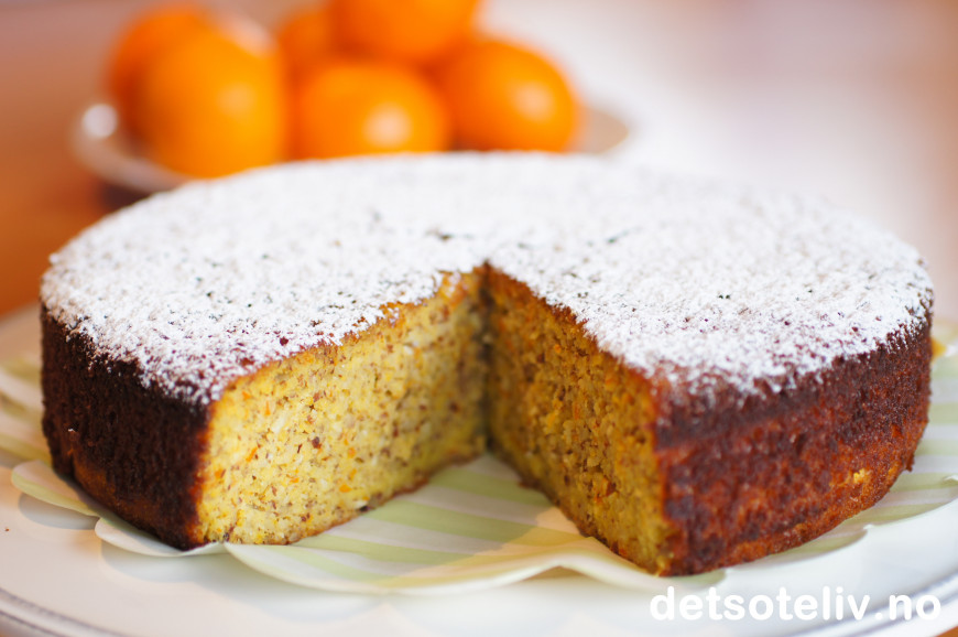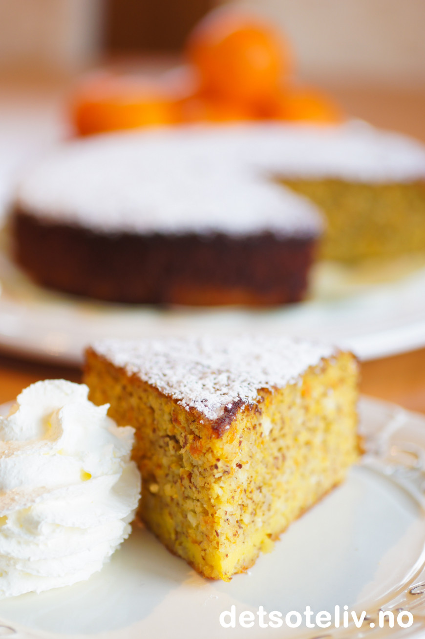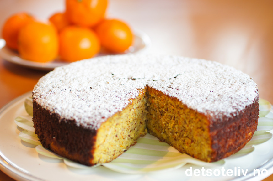I januar er det fortsatt bugnende hyller med klementiner i matbutikkene. En spennende måte å bruke dem på er å lage denne friske Klementinkaken. Her kokes klementinene i 2 timer før de moses hele og blandes inn i deigen. Malte mandler erstatter hvetemel i denne kaken, så kaken er naturlig glutenfri. Kaken serveres gjerne med søt krem, men aller helst med gresk yoghurt og brunt sukker. Crème fraîche med brunt sukkerdryss funker også veldig bra!
