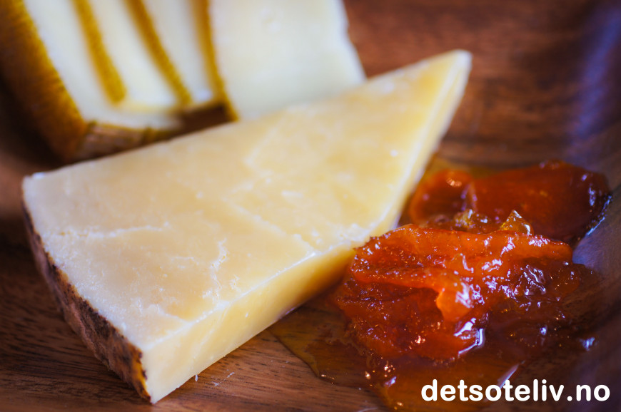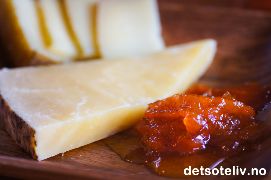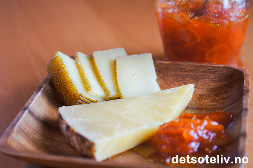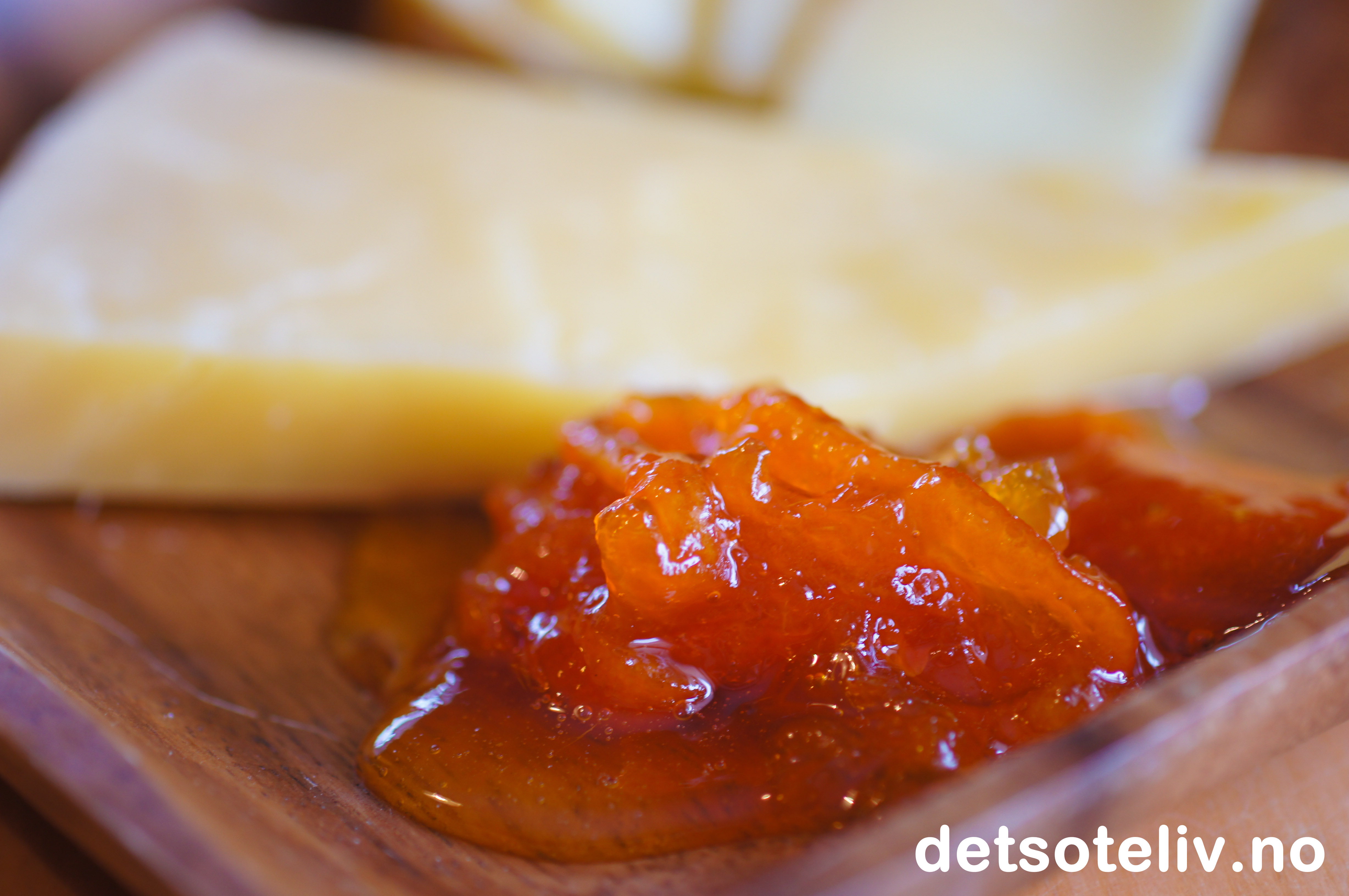 Her serverer jeg nylaget "Klementinmarmelade" sammen med skiver av en god "Manchego" og et stort stykke moden "Cheddar Montgomery".