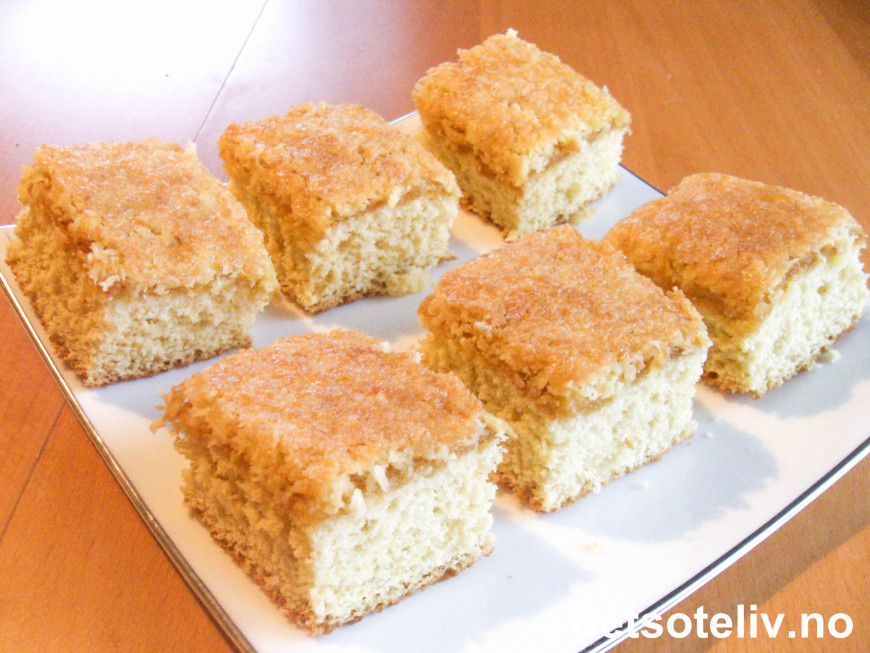 Ta kaken ut av ovnen etter at den som sagt har stekt i 20 min. Fordel kokosblandingen jevnt over kaken. Sett kaken tilbake i ovnen og stek videre midt i ovnen ved 200°C i 5-10 min. Kokosdekket skal ha fått gylden farge. Avkjøl kaken i formen. Del den så opp i firkanter. Løft kakestykkene ut av formen med en stekespade (se tips).