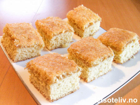 Bre deigen utover i en stor, bakepapirkledd langpanne (ca 30x40 cm). Stek kaken midt i ovnen ved 200°C i 20 min.
