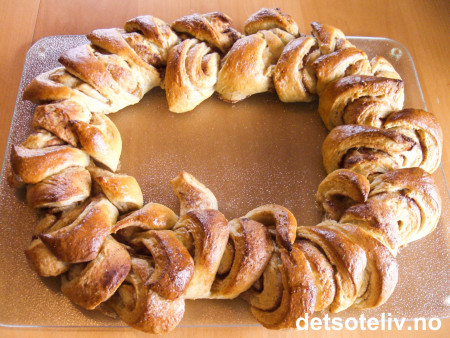 Ta deigen på bordet og trill den til en lang pølse. Klapp pølsen flat og kjevle den ca 25 cm bred. Smør over mykt smør og dryss over kanel og sukker. Rull sammen til en fast rull. Form den som en krans på en stekeplate som er dekket med bakepapir. Fest skjøtene godt sammen.