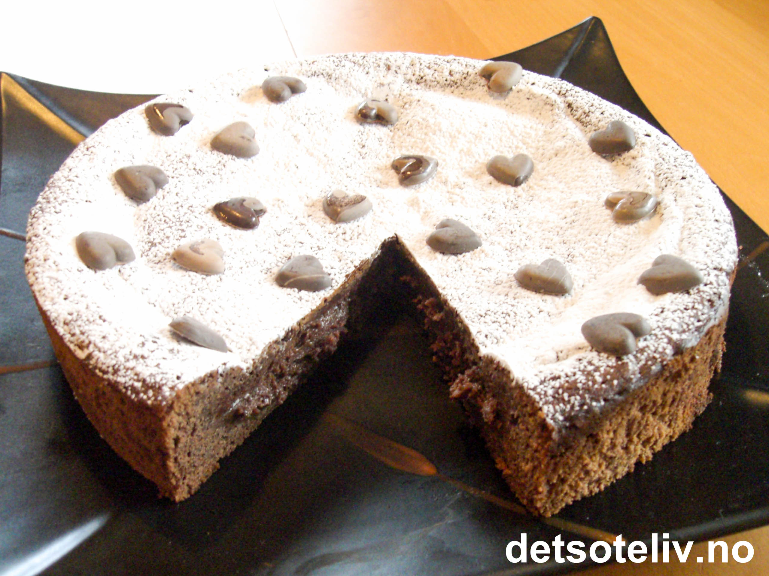 Avkjøl kaken helt i formen ved å la den stå i kjøleskapet over natten. Når kaken har stått kaldt en hel natt, har den stivnet og kan tas ut av formen. Fjern bakepapiret og sett kaken på et passende fat. Pynt kaken eventuelt med melisdryss og mørke sjokoladehjerter slik som på bildet.