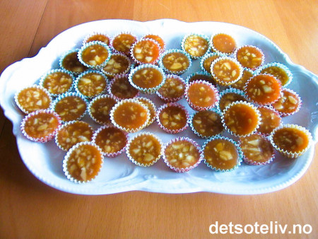 Sett brettet med formene forsiktig i kjøleskapet og la stå til "Knekken" har stivnet til fine karameller.