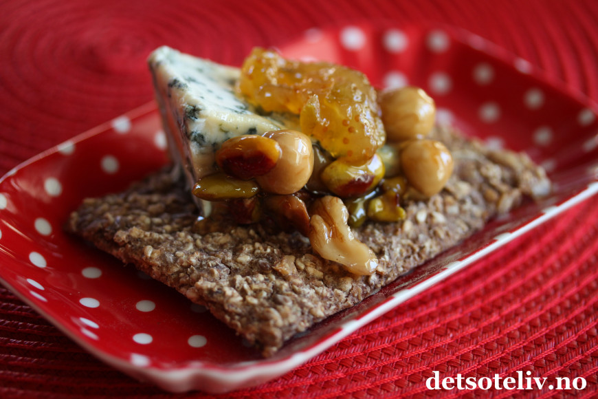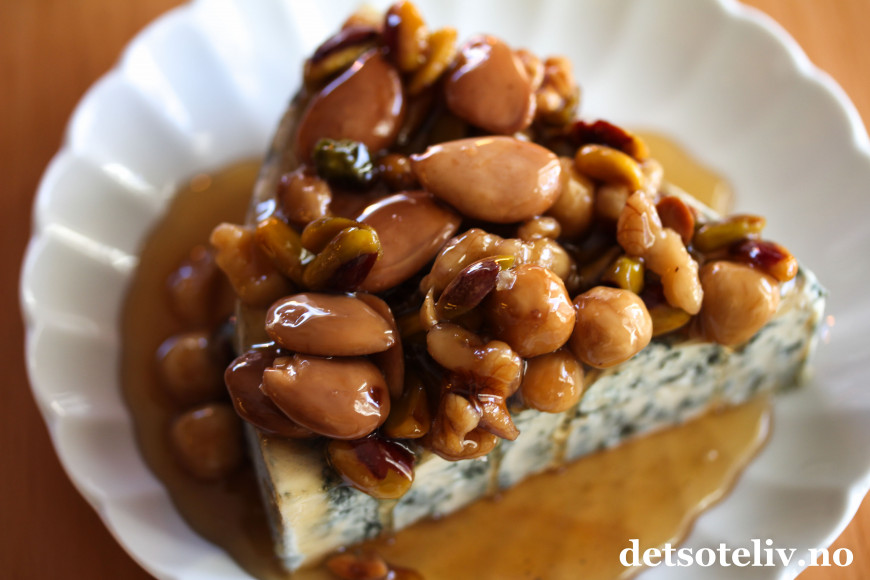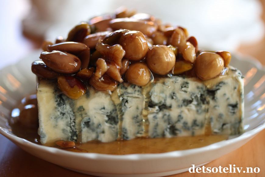 Prøv med en blåskimmelsost dekket med honningnøtter: