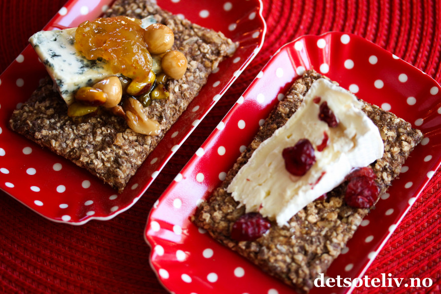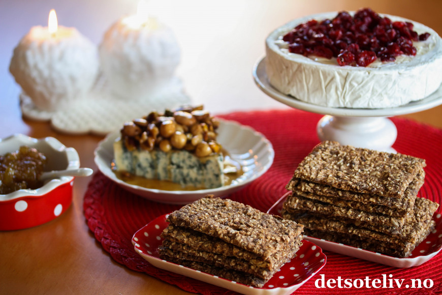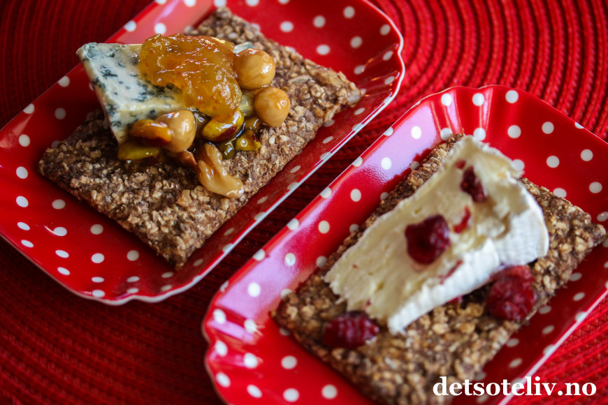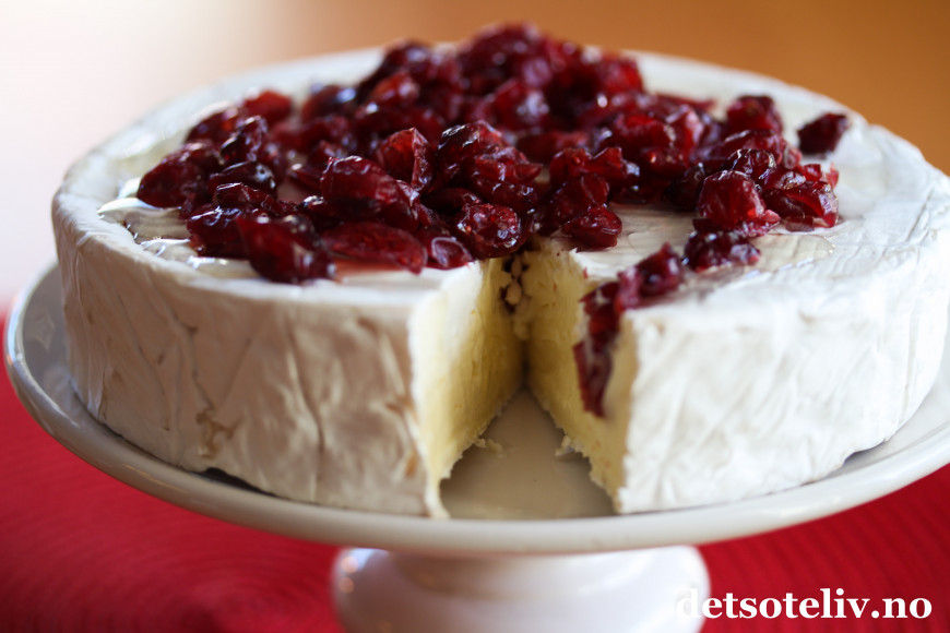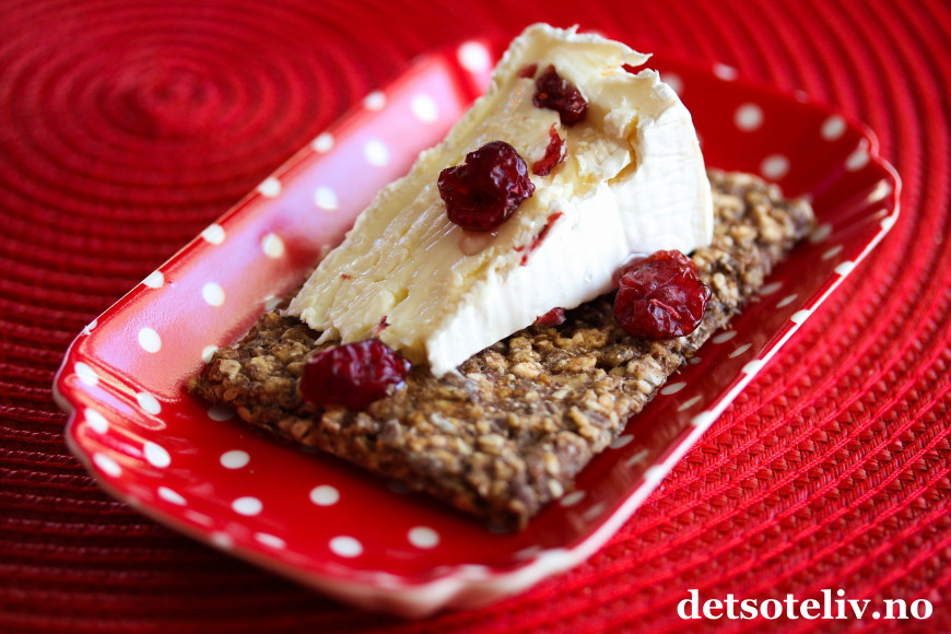 Eller server knekkebrødene sammen med en brie som du dekker med tørkede tranebær og honning: