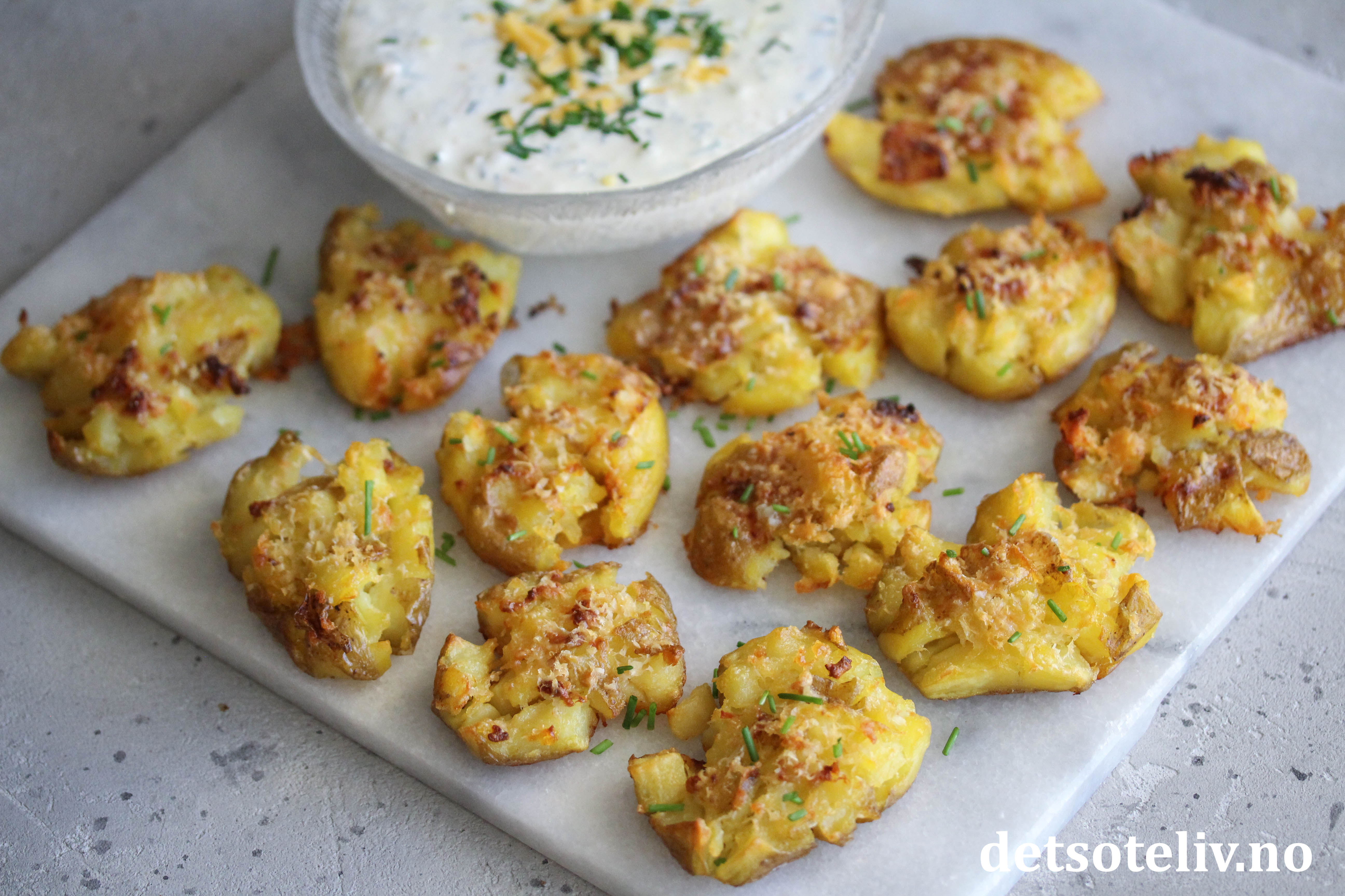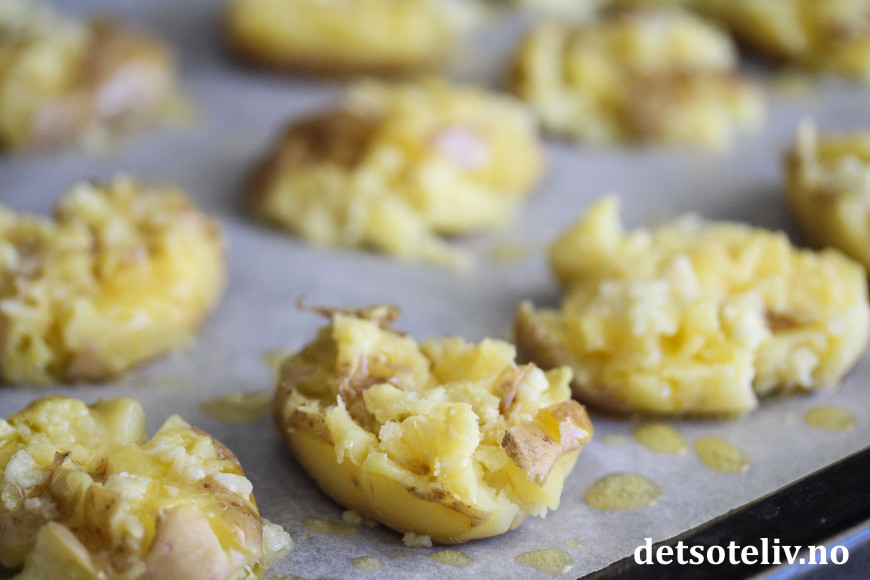 Her forvandles kokte småpoteter til ekstra deilige, ovnsstekte poteter! De kokte potetene knuses først med en potetstamper, en gaffel, et glass eller lignende. Deretter pensles de med hvitløkssmør og drysses gjerne også med revet parmesanost, før de stekes i ovnen til de blir crispy på utsiden, men fortsatt myke inni.