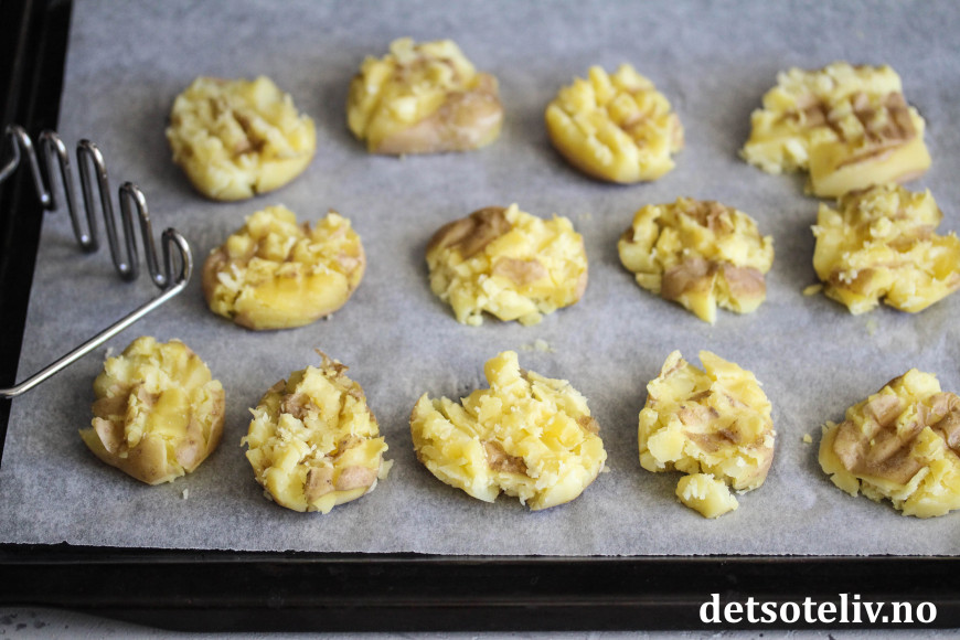 Knus potetene ved å trykke dem forsiktig ned med en potetstamper, en gaffel eller et glass. Det er meningen at potetene skal sprekke opp og knuses flate, men de skal fortsatt henge sammen, så ikke vær for hardhendt.
