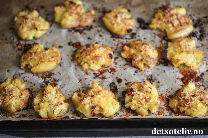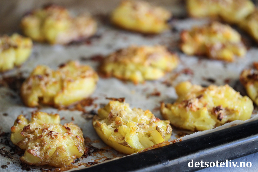 Knuste poteter (Smashed potatoes) med hvitløkssmør og parmesan