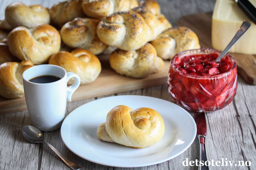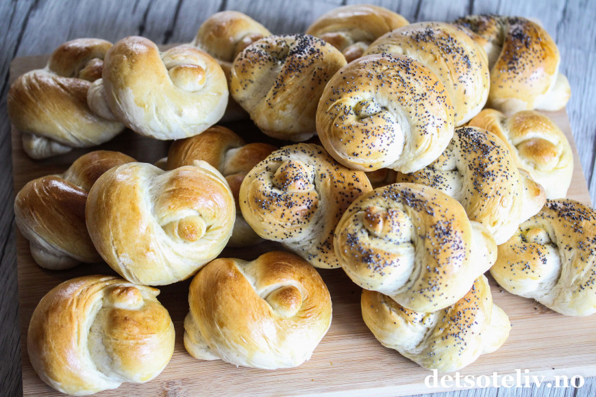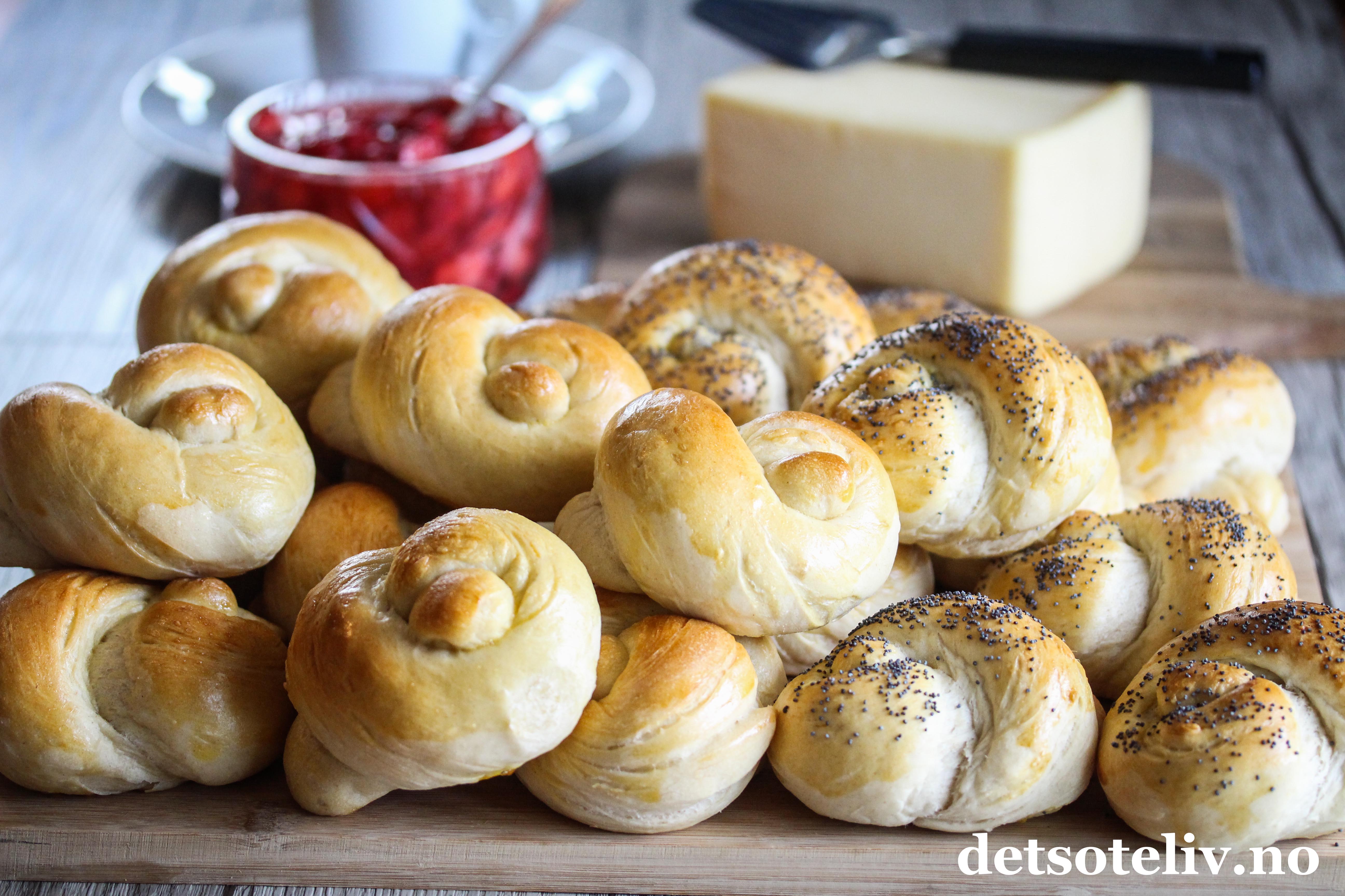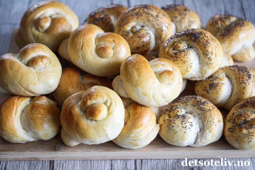 ♥ Disse knuterundstykkene er laget av fin gjærdeig og får derfor loff-konsistens. Det er såklart ikke noe i veien for å slå knute på deigen hvis du heller lager rundstykker med grovere gjærdeig.
