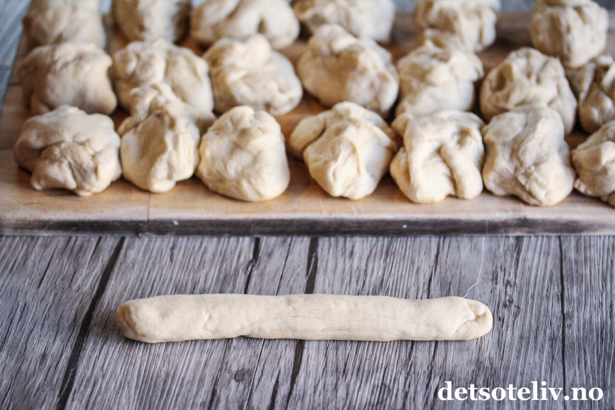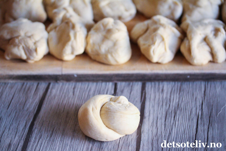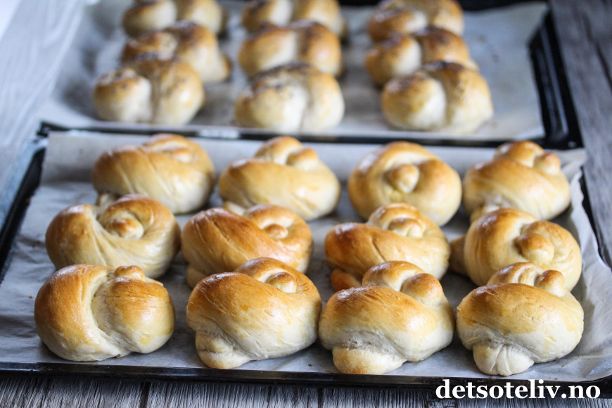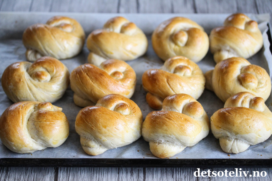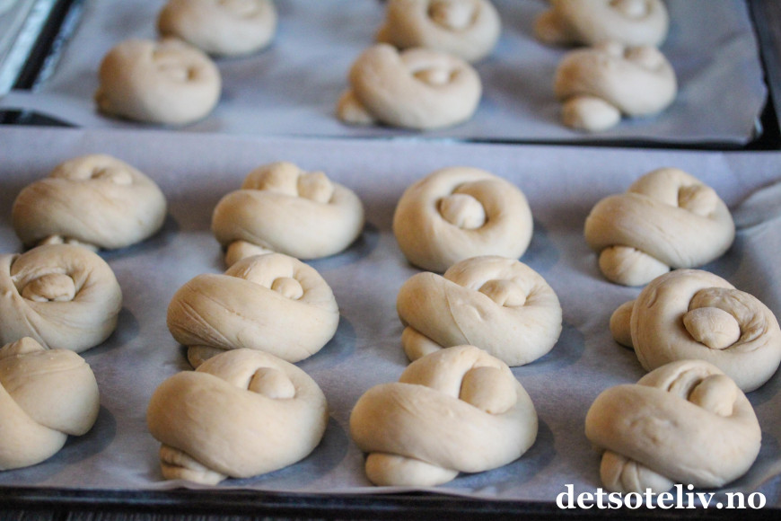 Trill hvert emne til en lengde (ca. 20 cm lang) som du slår en knute på. Legg knuterundstykkene på to bakepapirdekkede stekeplater og la dem etterheve i 30 minutter.
