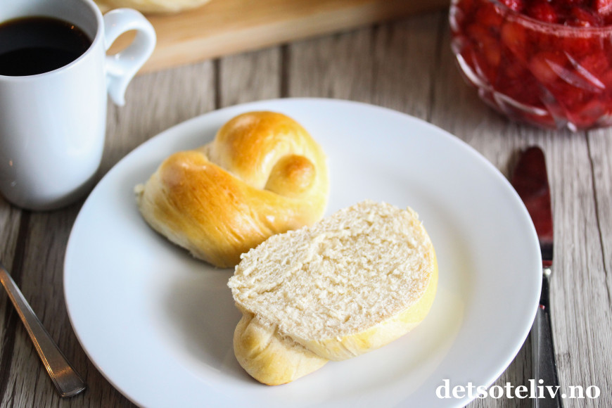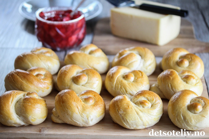 Her har jeg laget noen myke, lyse rundstykker med artig knutefasong.