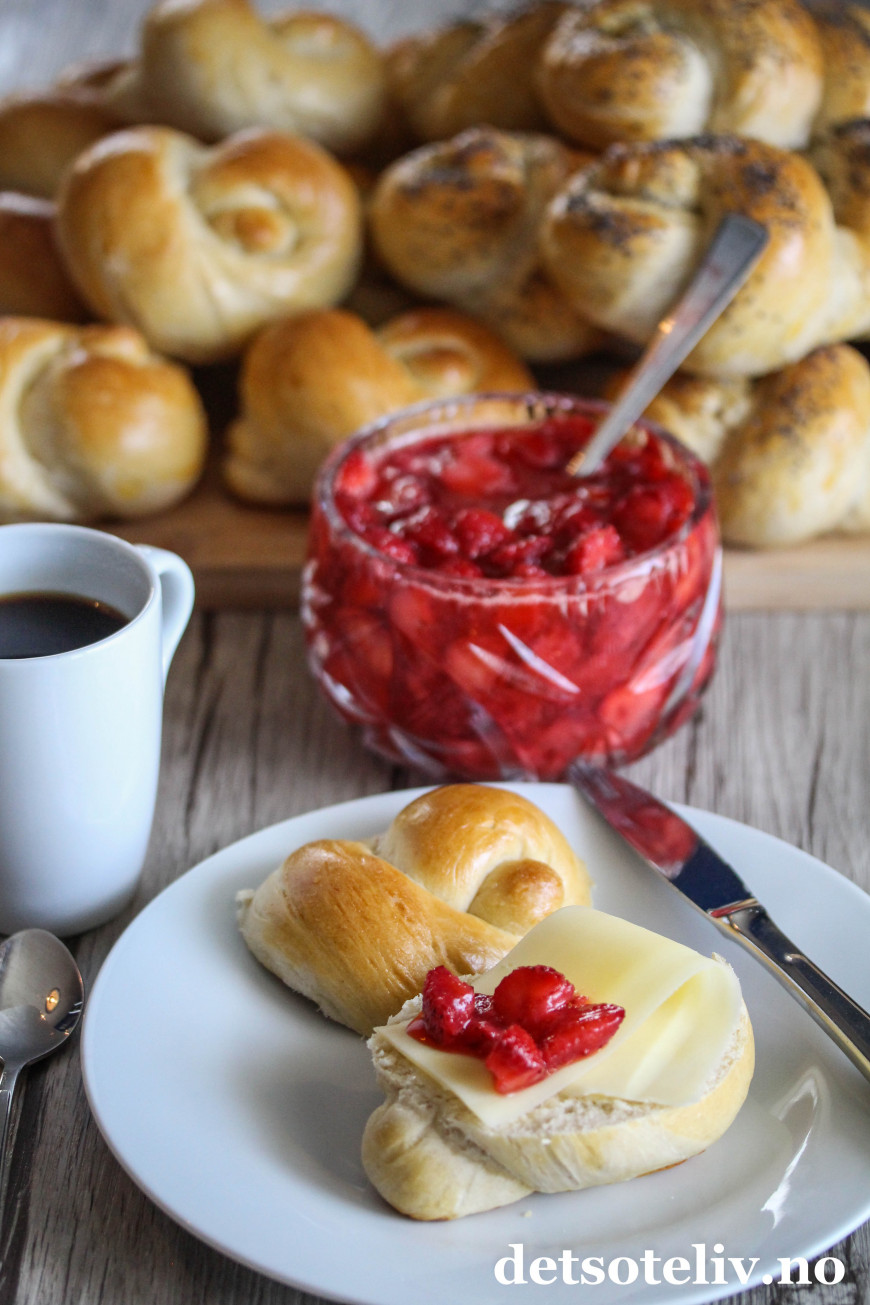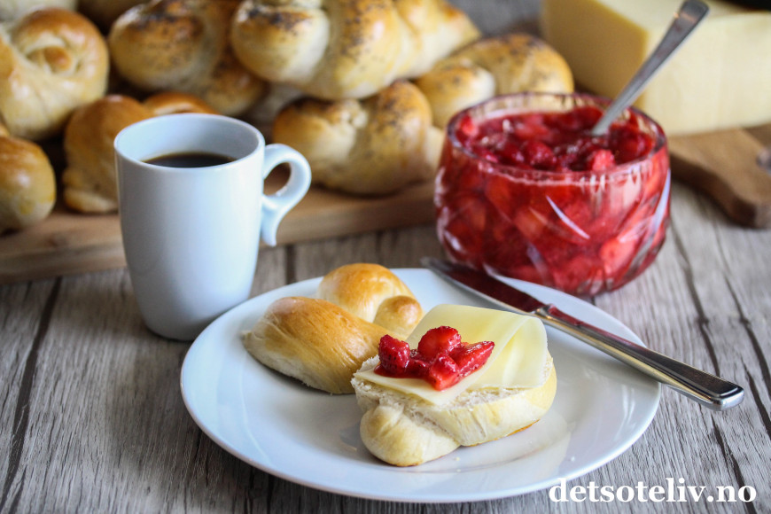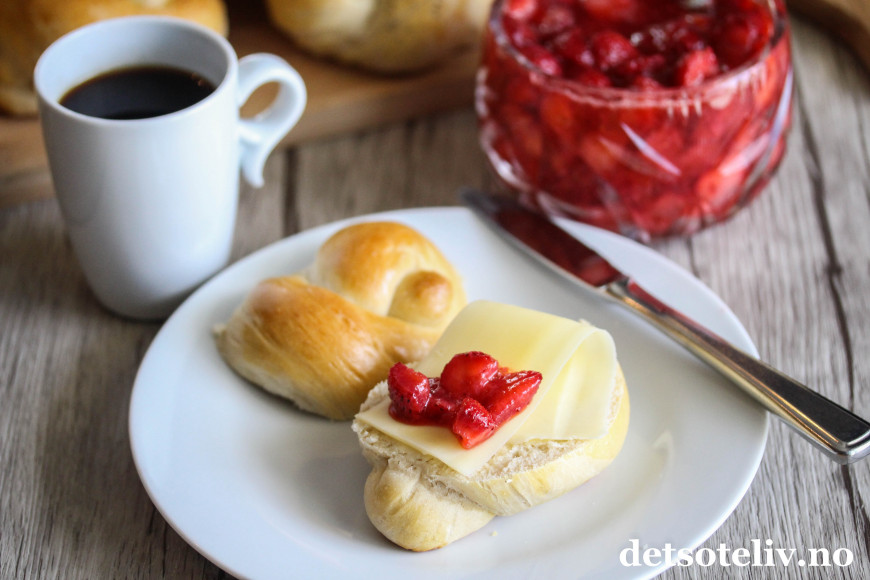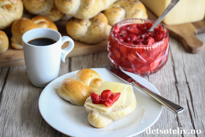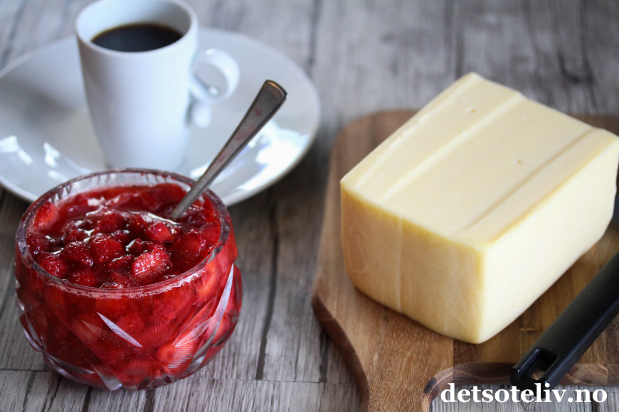 En klassiker er gulost og rørt jordbærsyltetøy!