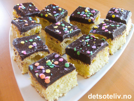Ha deigen i en liten, bakepapirkledd langpanne (ca 20x30 cm). Stek kaken midt i ovnen ved 175°C i ca 35 min (sjekk med kakenål at kaken er gjennomstekt). Avkjøl kaken i formen. Ta kaken ut av formen og dra av bakepapiret.