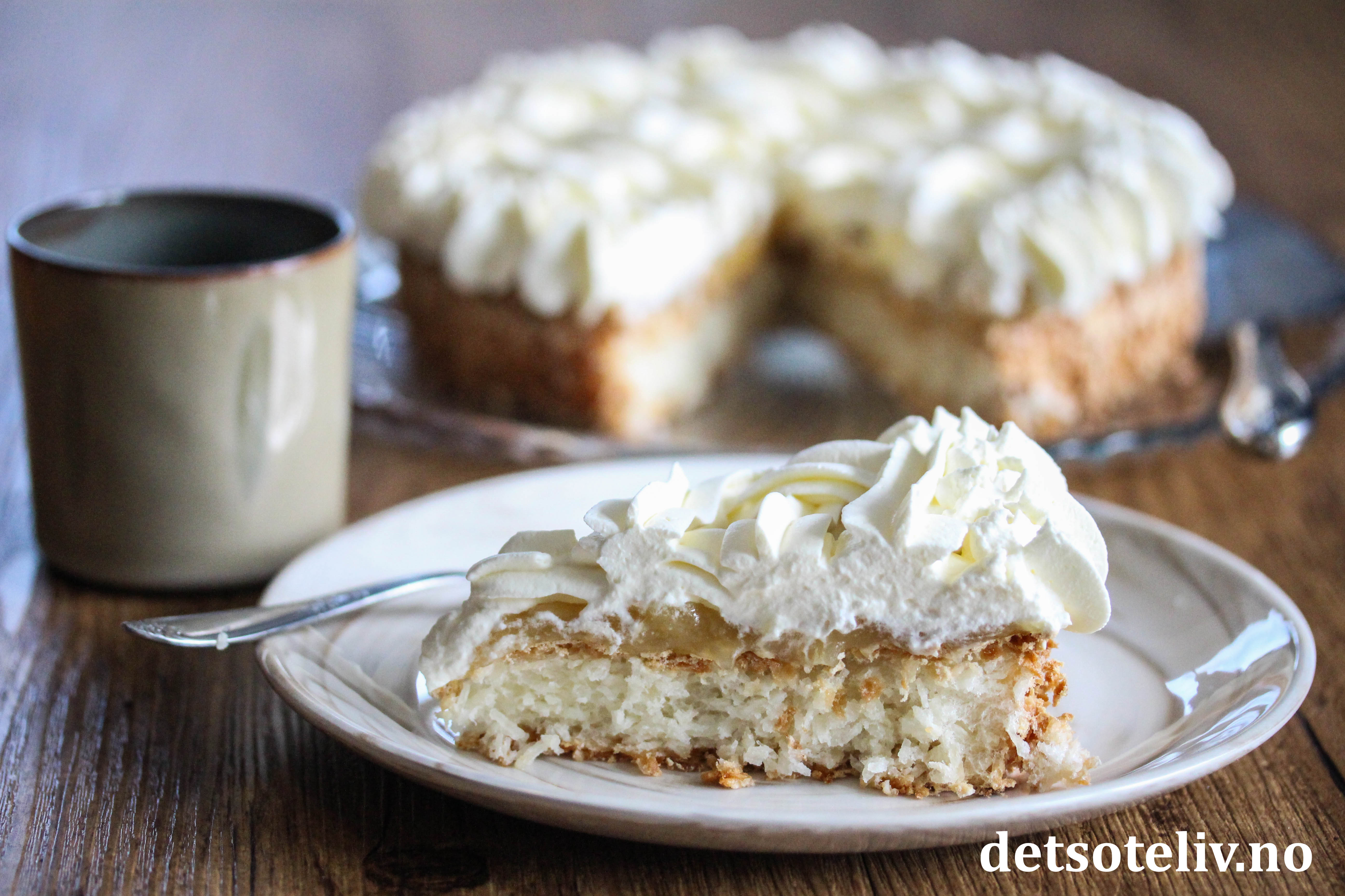 For en annen variant, se Kokoskake med rabarbrakompott og krem. Se også Kokosmarengskake, som er nokså lik kake som denne, men uten eplemos.