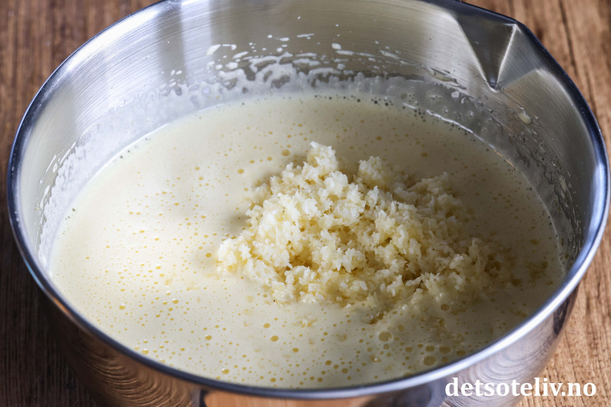 Pisk egg og sukker til eggedosis. Vend inn kesam og kokosblandingen.
