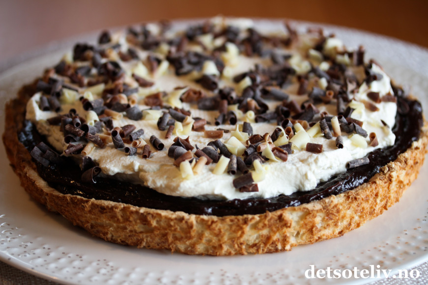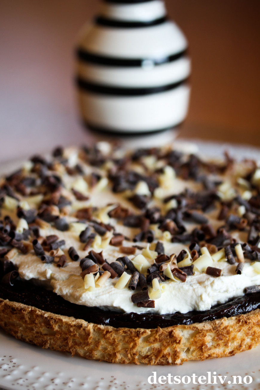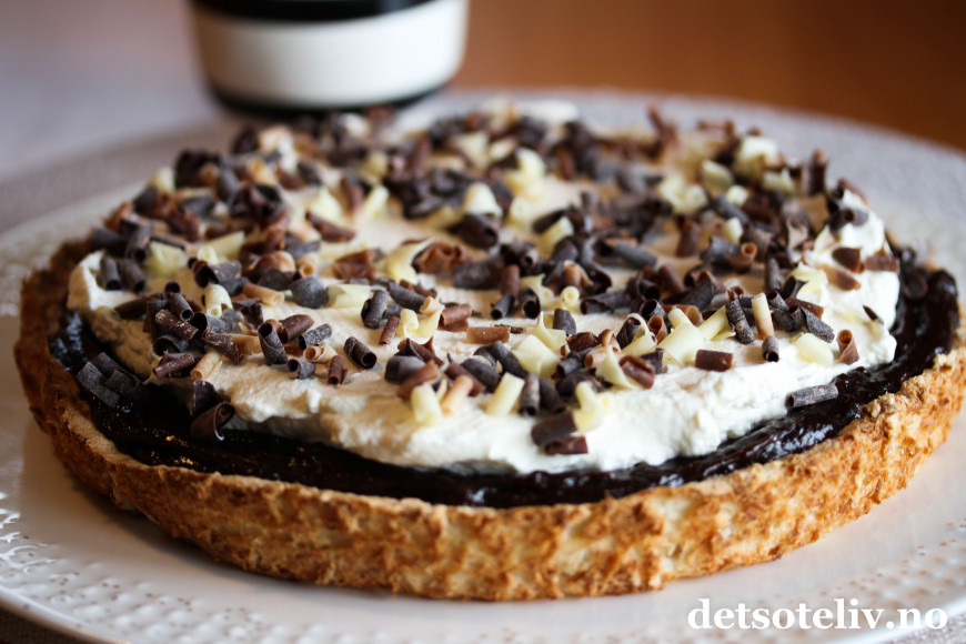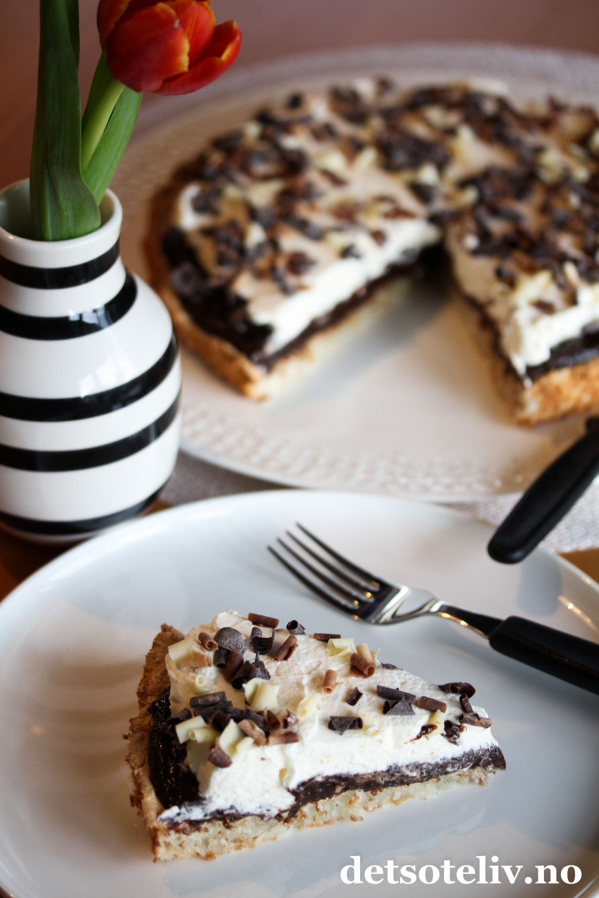 ♥ Det går fint å lage kokosbunnen og dekke den med sjokoladekremen dagen før servering. På serveringdagen pyntes kaken med pisket krem slik at kremen blir luftig og helt fersk.