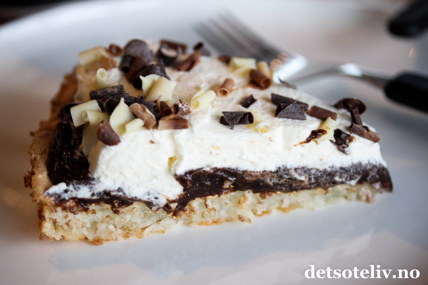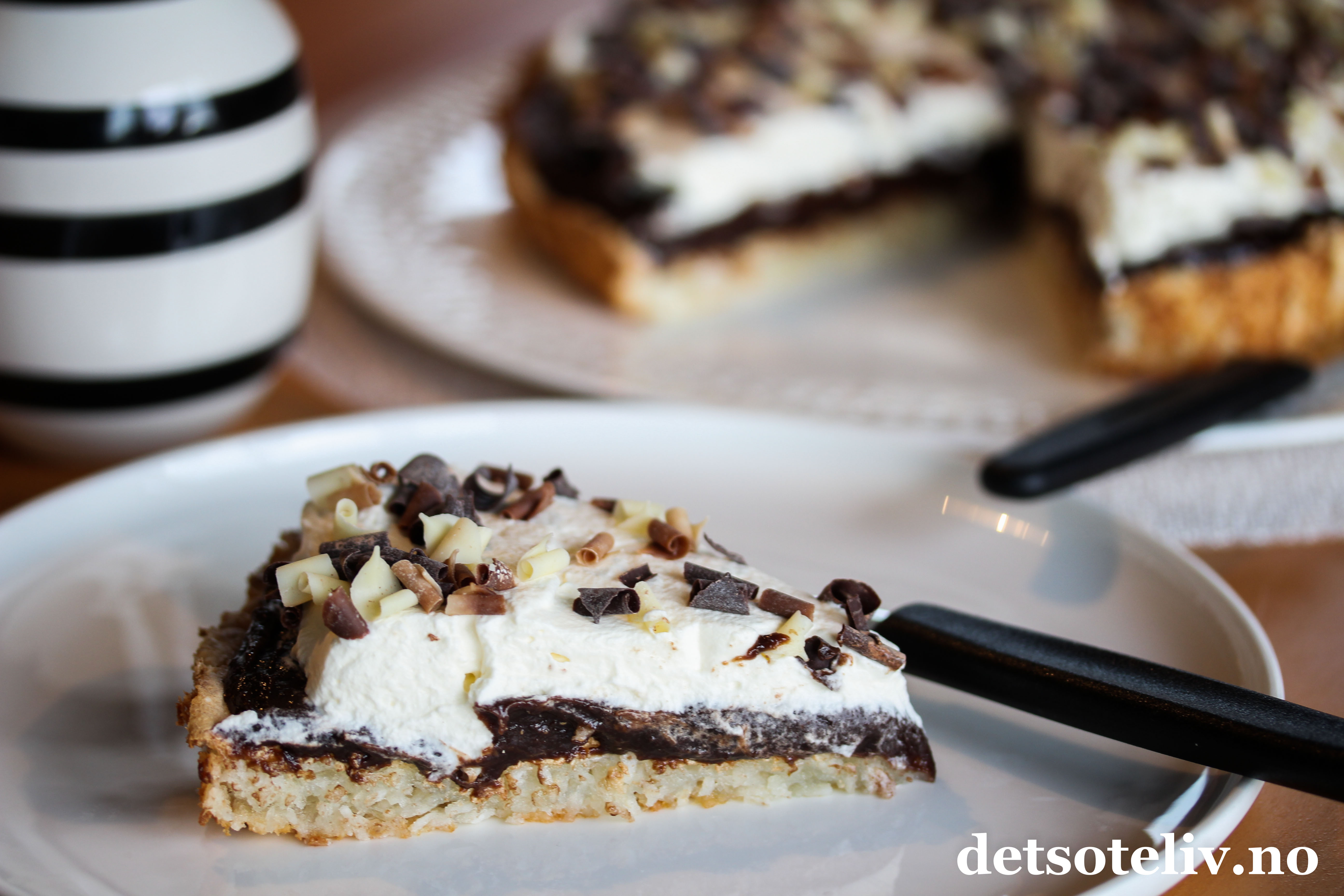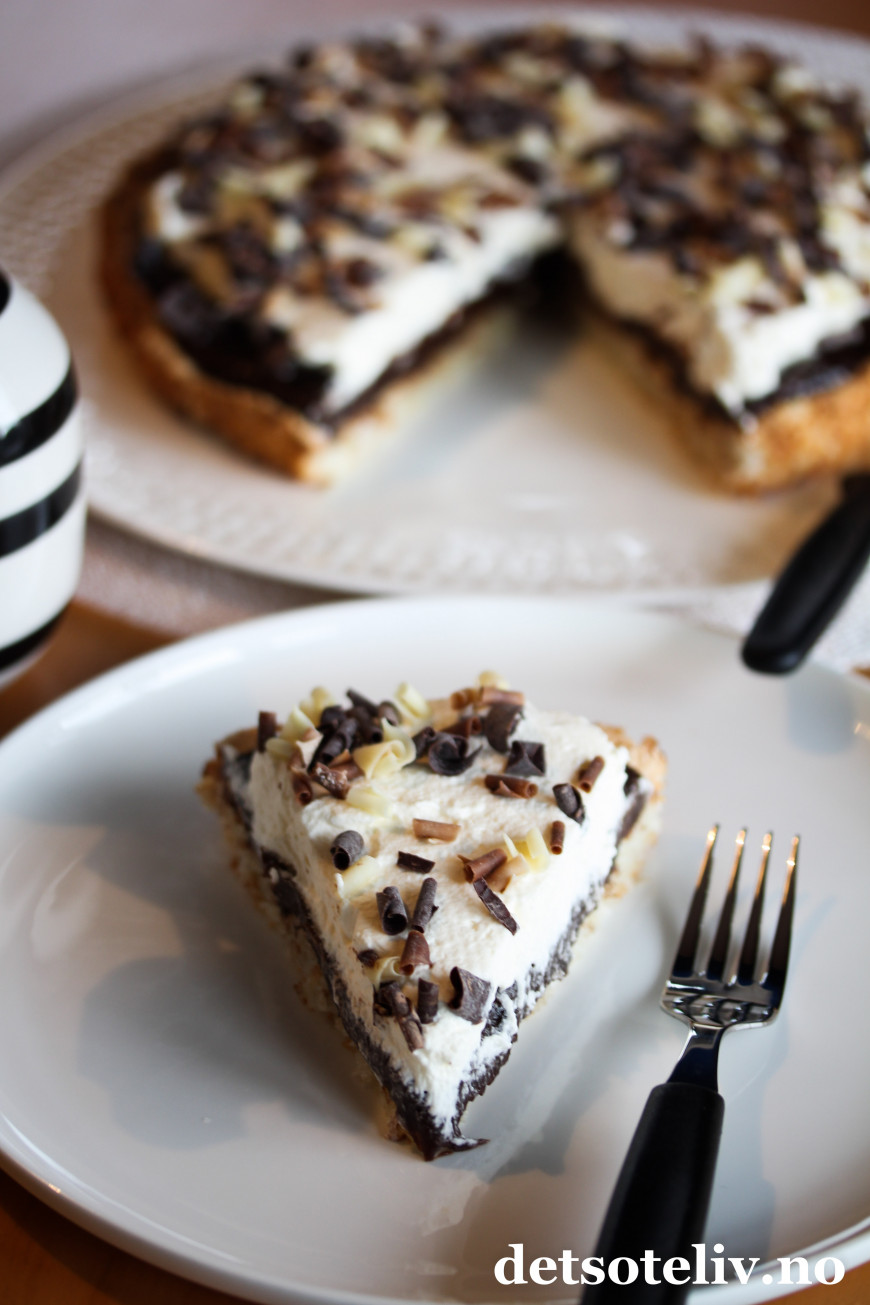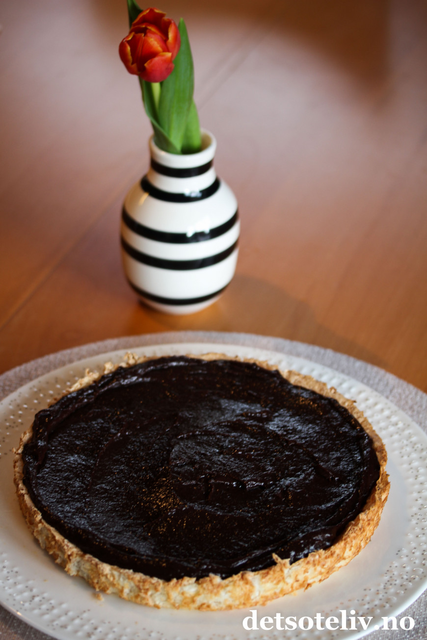 ♥ Det går fint å lage kokosbunnen og dekke den med sjokoladekremen dagen før servering. På serveringdagen pyntes kaken med pisket krem slik at kremen blir luftig og helt fersk.