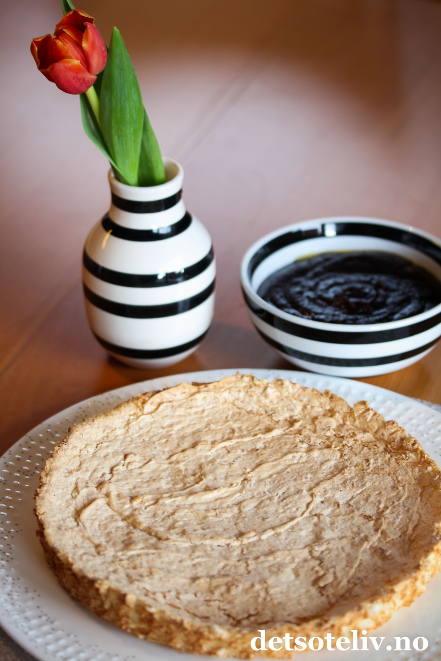 Bre marengsen utover bunnen i en rund, kakeform (24 cm i diameter) med bakepapir i bunnen. Stek kaken midt i ovnen ved 200°C i 15-20 minutter. La kaken bli helt kald i formen (se tips).