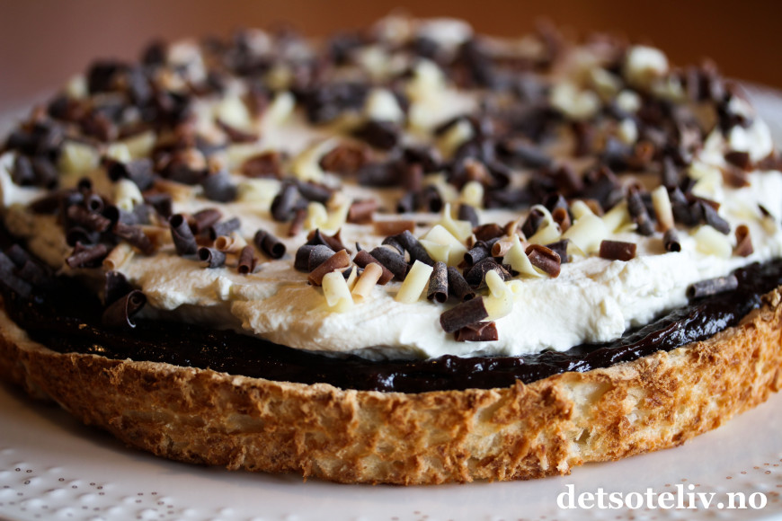 I dag kan jeg by på en nydelig, myk kokoskake som dekkes først med en deilig sjokoladekrem og deretter med hvit, pisket krem.