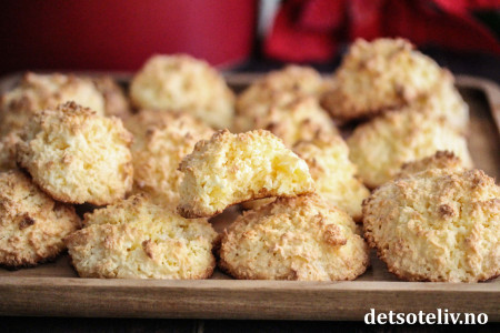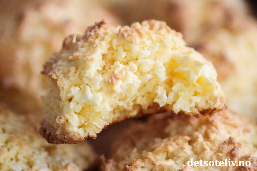Her er en ny variant, som lages med hele egg og ikke bare eggehviter. Det gjør at kokosmakronene får en litt mer gyllen farge.