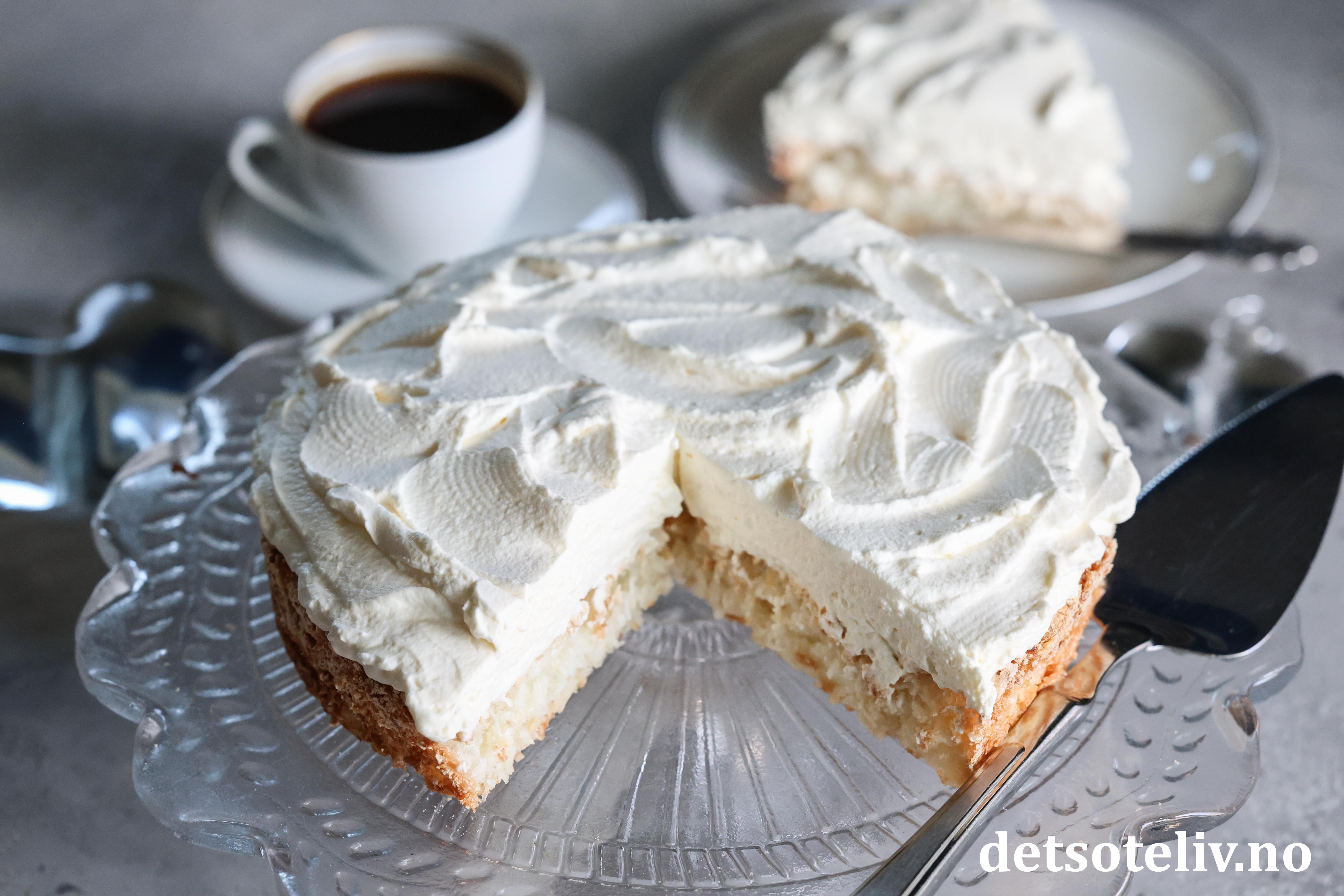 Her har du en kake, som er som en stor og ekstra saftig kokosmakron! 😍 Dekket med pisket krem blir dette en superdeilig sak!