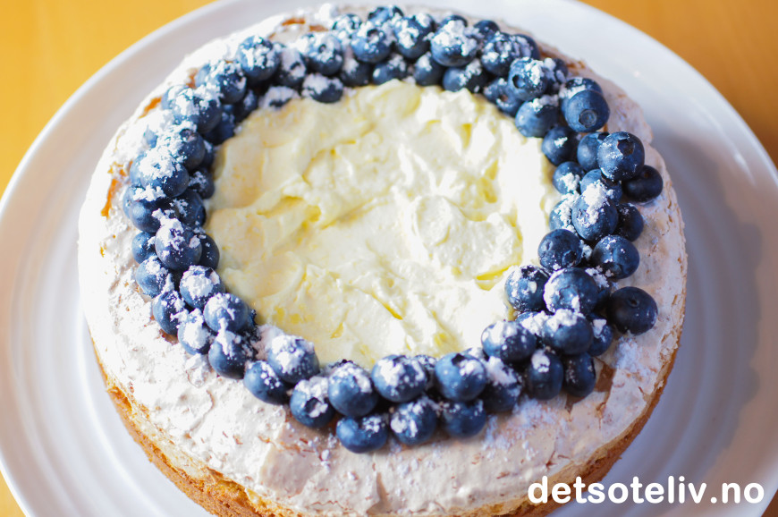 ♥ På sommeren er det lekkert å pynte kaken med frisk blåbær. Jordbær og/eller bringebær er også nydelig.
