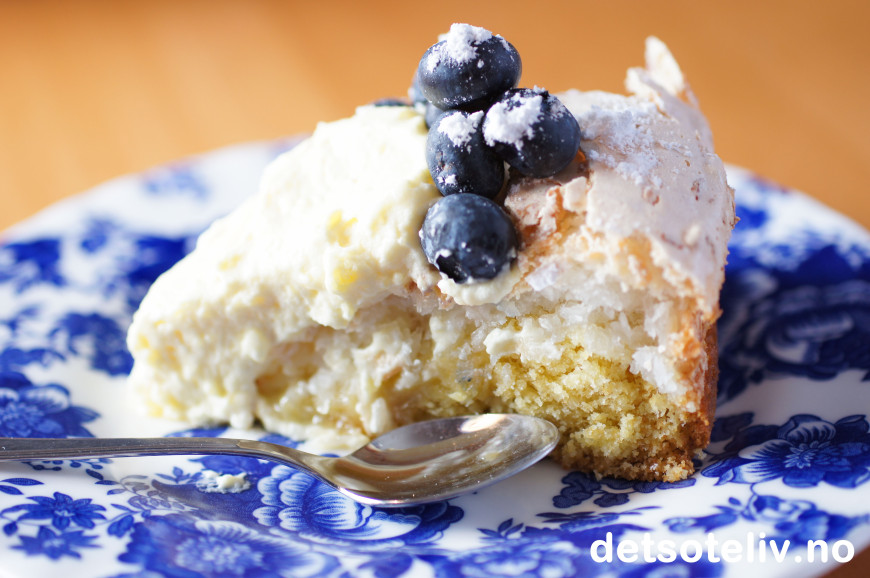 Nydelig, myk kake som dekkes med kokosmarengs og pyntes med krem og blåbær!