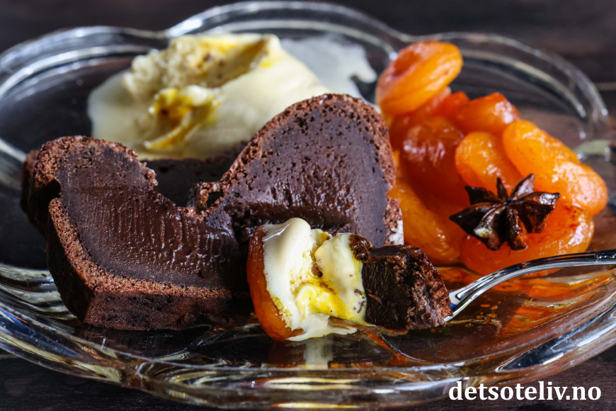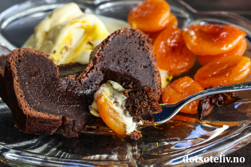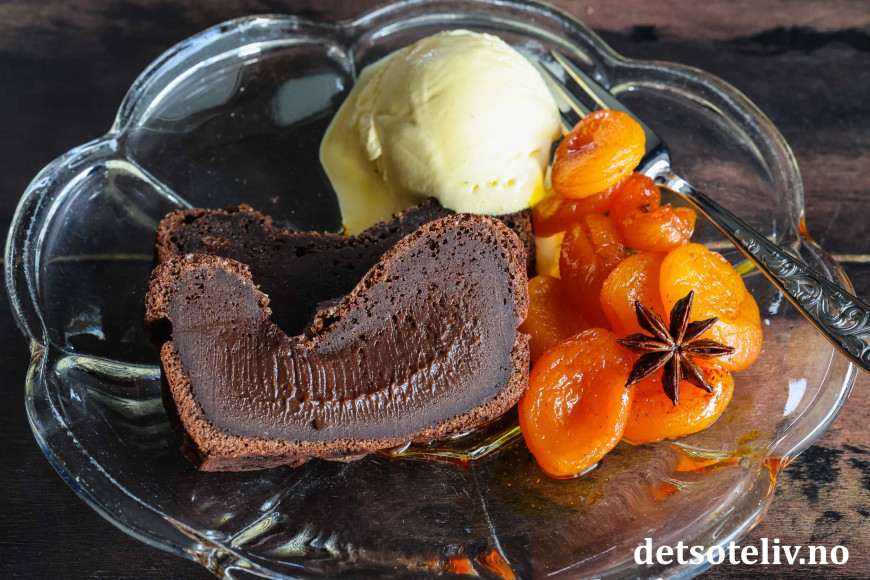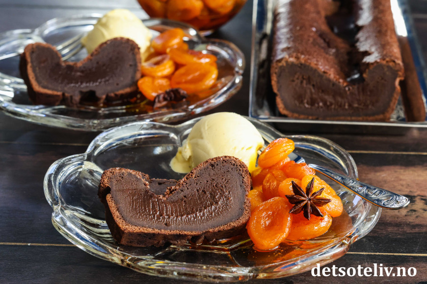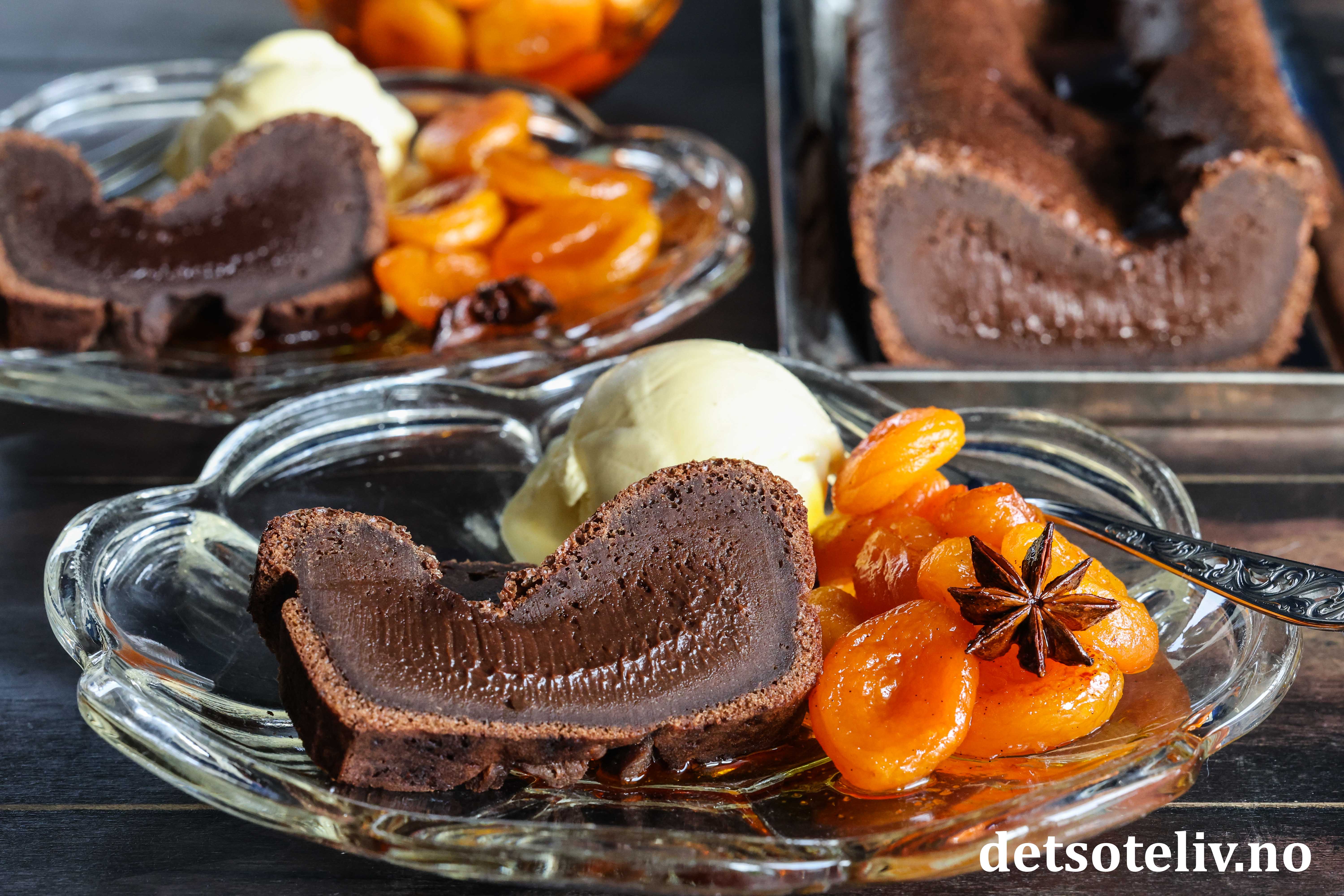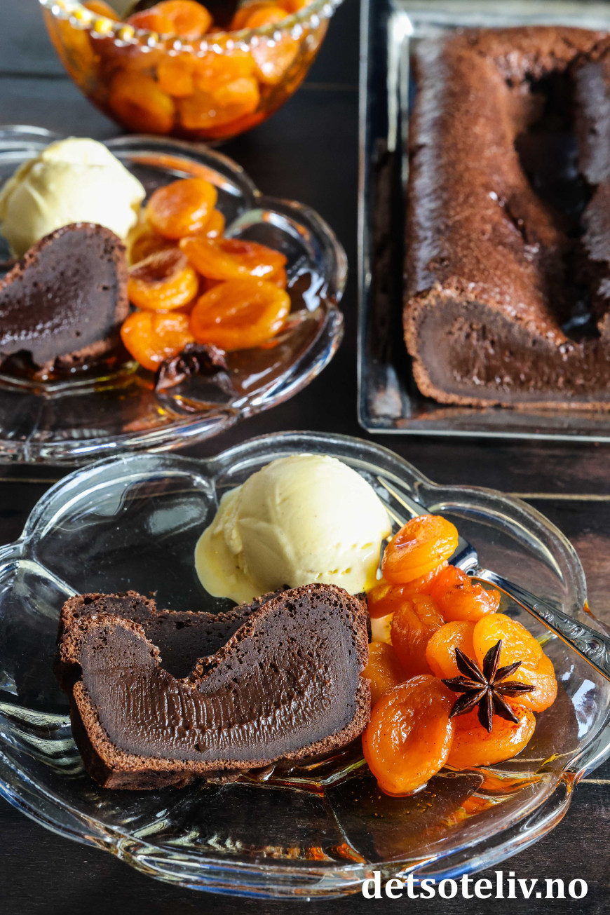 Konfektkaken serveres her sammen med krydderkokte aprikoser og vaniljeis, men sjokoladekaken er vel så nydelig sammen med vanlig, pisket krem eller bær og iskrem.