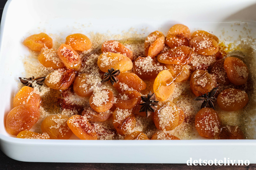 Bakes i ovnen ved 200°C i 20 minutter. Det brune sukkeret gir veldig god smak og gjør at aprikosene blir nokså mørke i fargen.