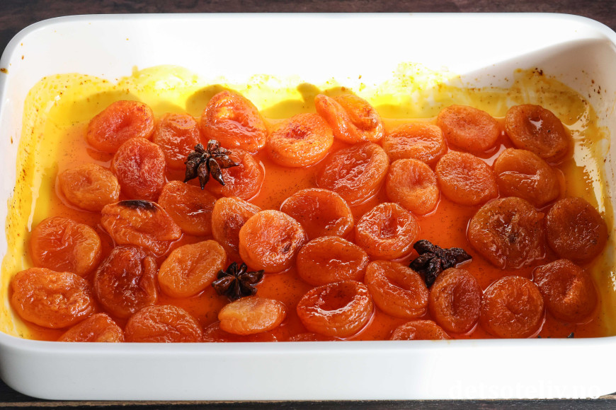 Ha aprikoser i en liten, ildfast form. Hell i vannet.