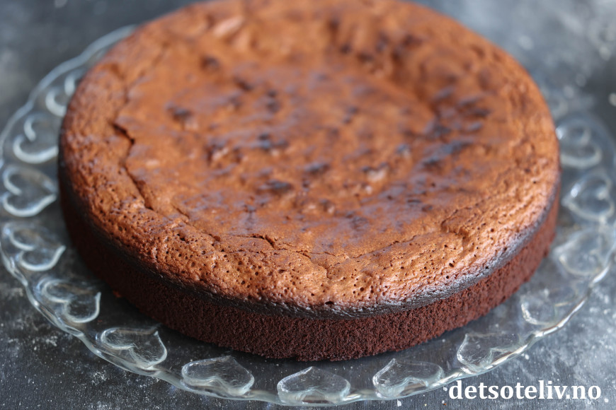 Ha deigen i en rund kakeform (24 cm i diameter) med bakepapir i bunnen. Stek kaken nederst i ovnen ved 225°C i 15 minutter. Kaken er da fortsatt nokså skjelvende og ikke gjennomstekt.