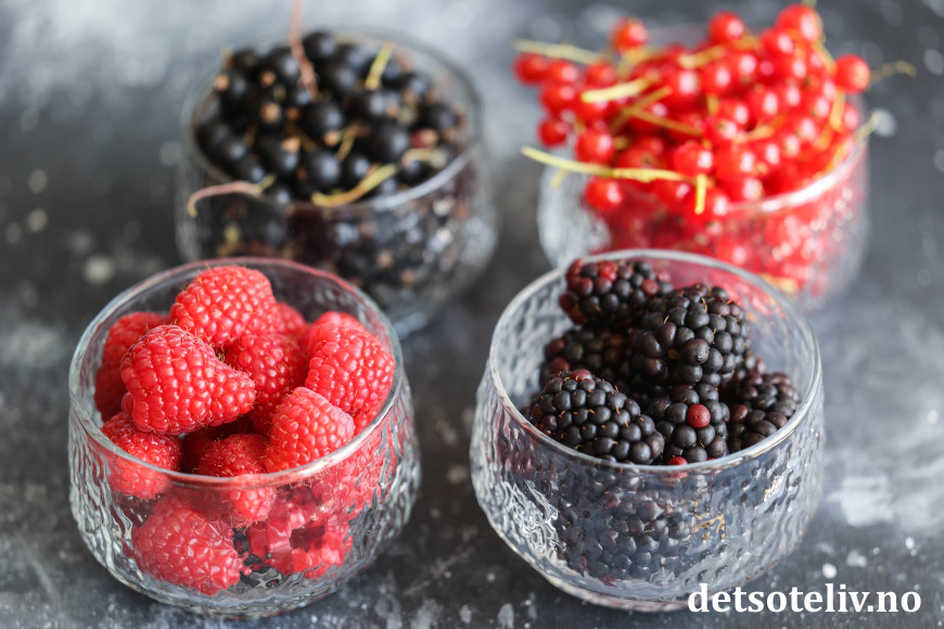 Jeg bruker her bringebær, bjørnebær, solbær og rips.