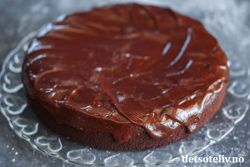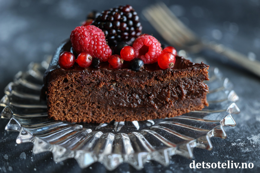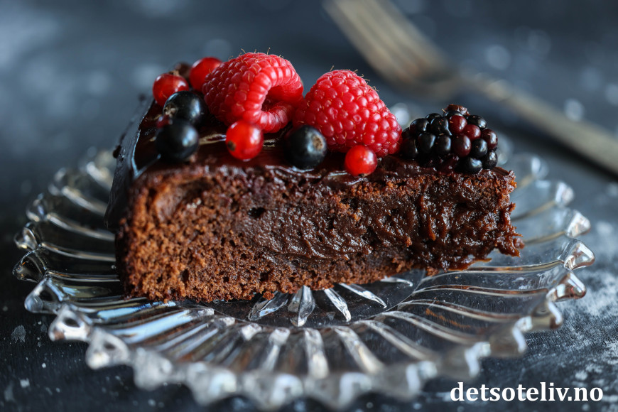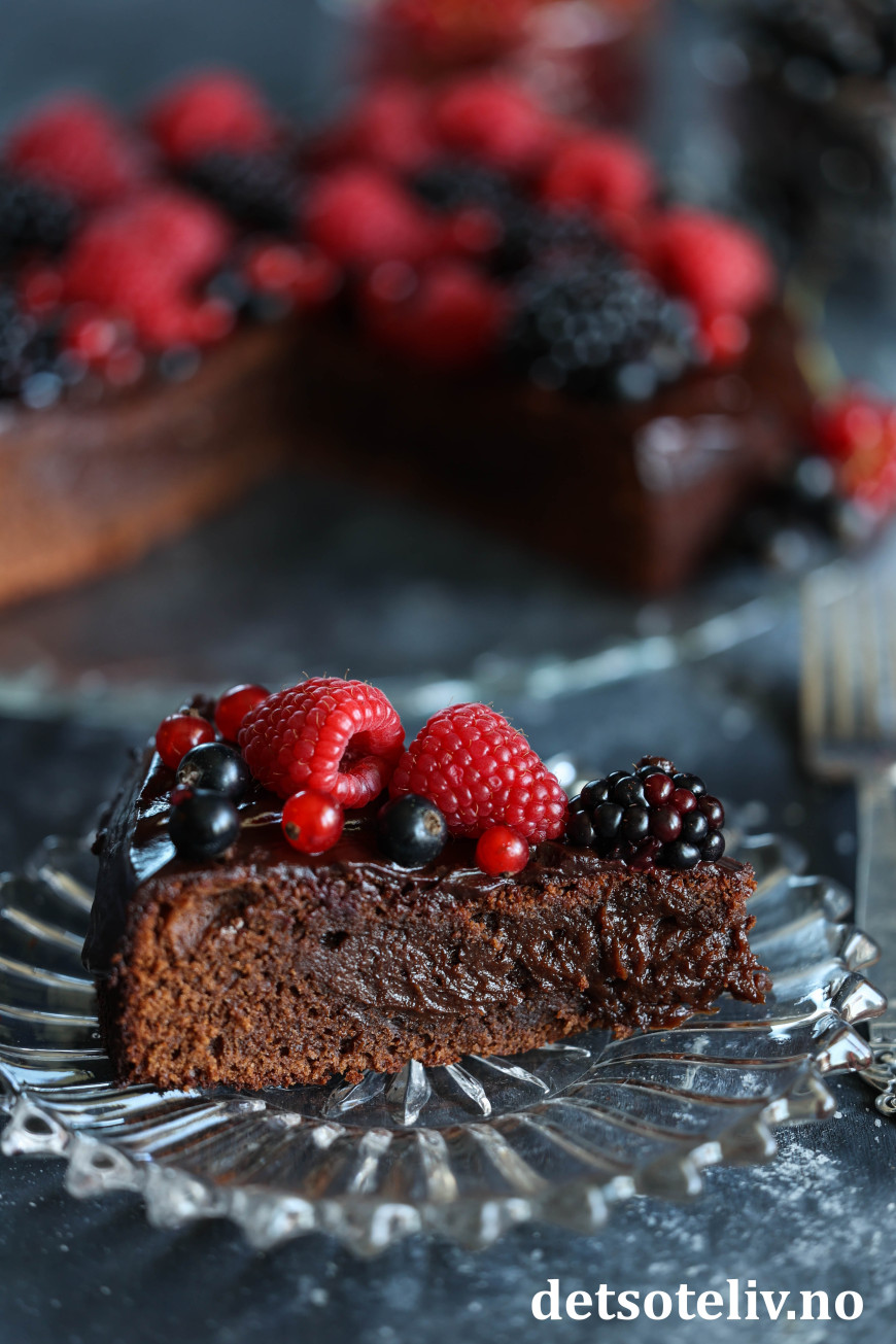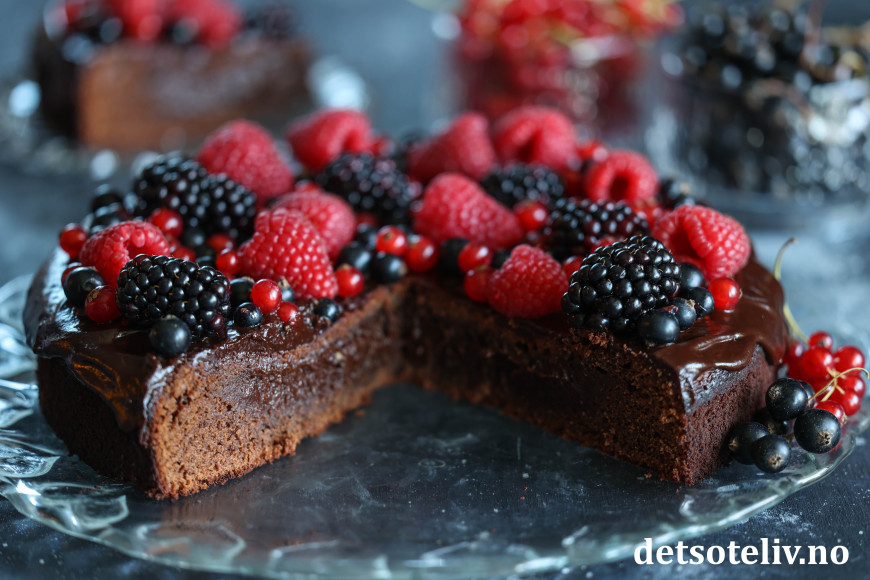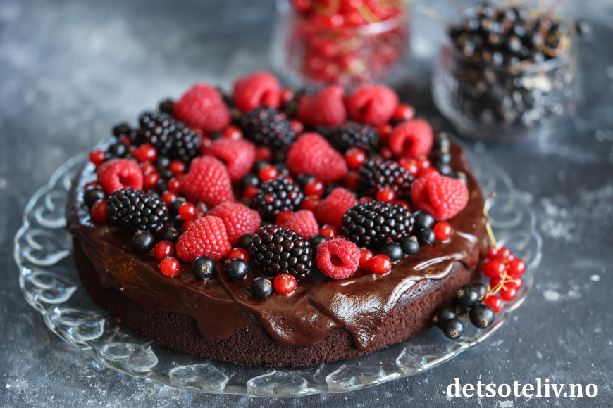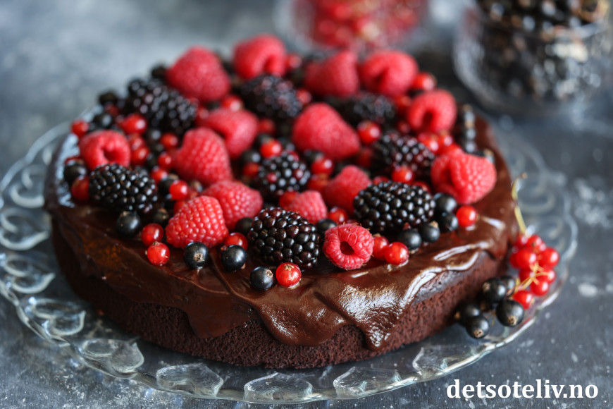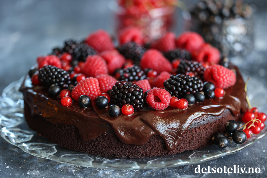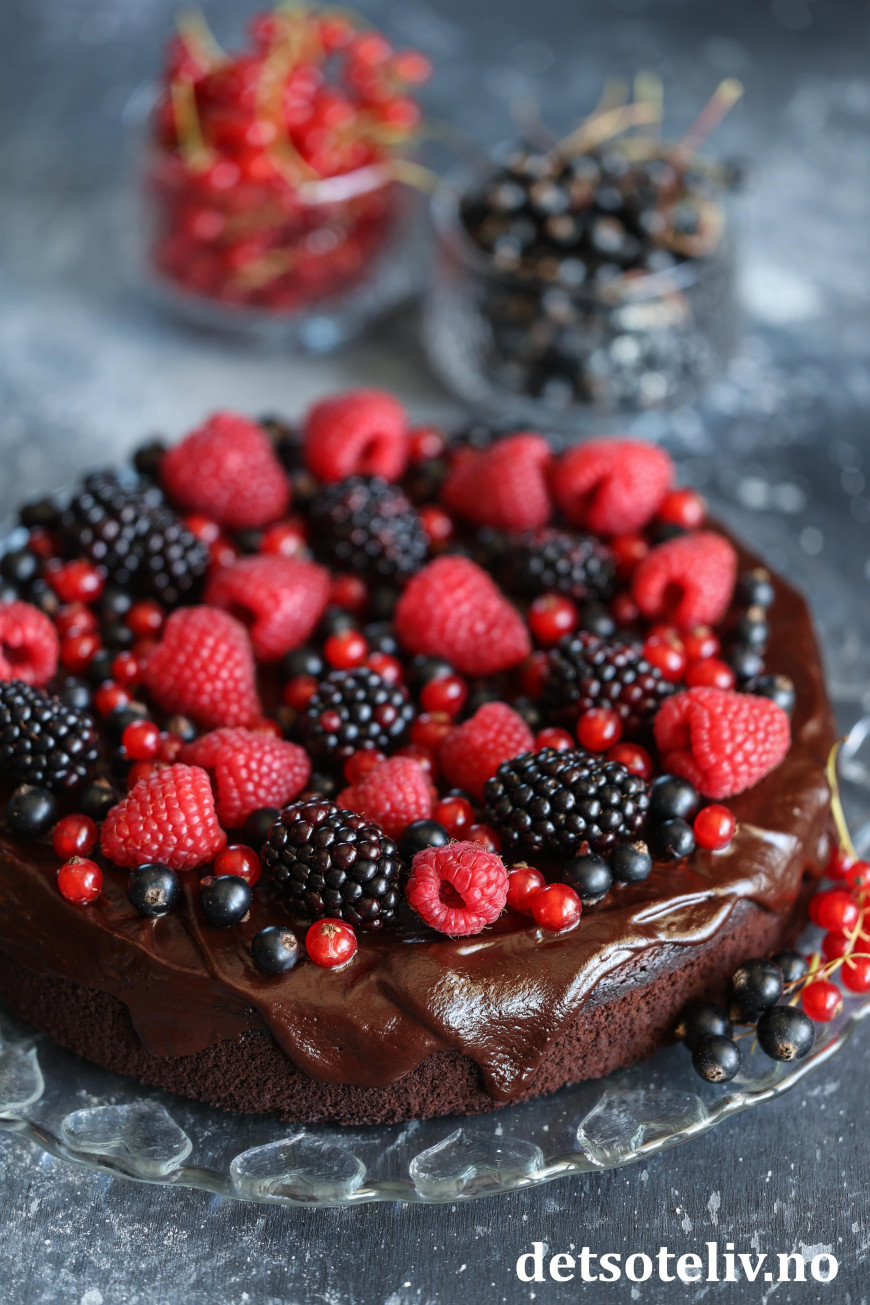 En drøm av en konfektkake som toppes med sjokoladeglasur og friske bær. 😍